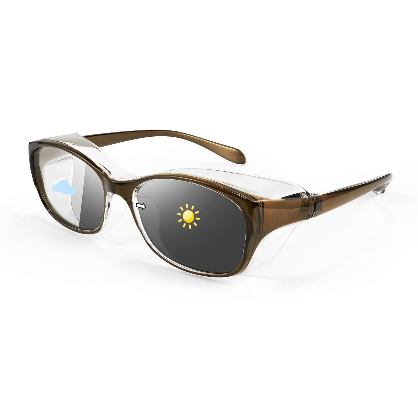 【調光変色】調光レンズとは太陽光の紫外線の強弱によって変色します。曇り空の太陽はそれなりに、光が強まるから弱まるまで、レンズの色が若干薄まることにより、視野の明るさを確保し。晴天の強烈な紫外線の下で,レンズは色が濃くなり、有効的に太陽の強い光から守って頂けます。