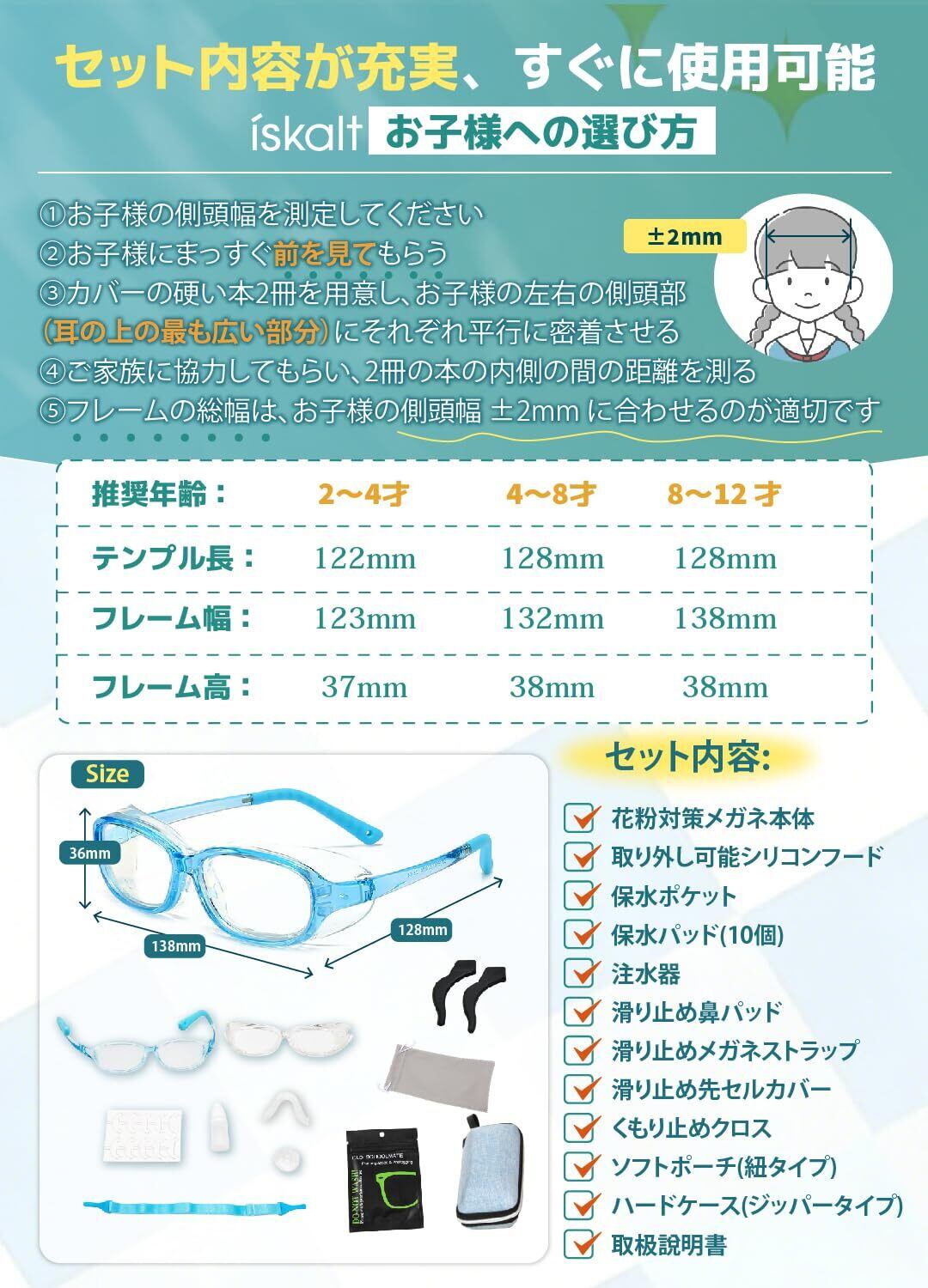 【お子様のための思いやり設計】この花粉 メガネ キッズ向け製品は、4~8歳と8~12歳のお子様に合わせて、2サイズのメガネをご用意しました。また、付属の取扱説明書には花粉症メガネとしての正しい使い方と注意点を詳細に解説しています。このメガネが、お子様の輝くお目元を守り続け、健やかに楽しく成長する毎日をお供できますように。