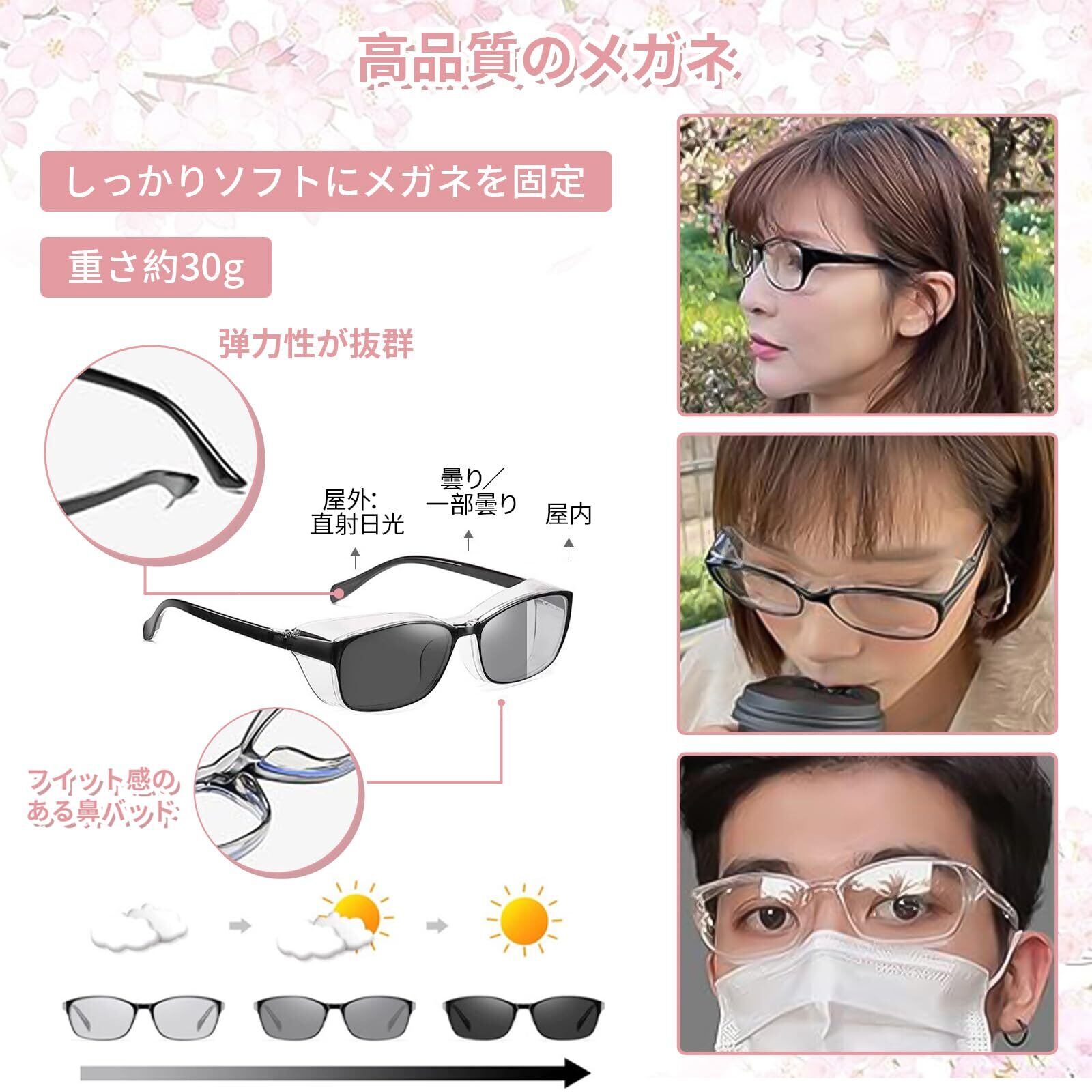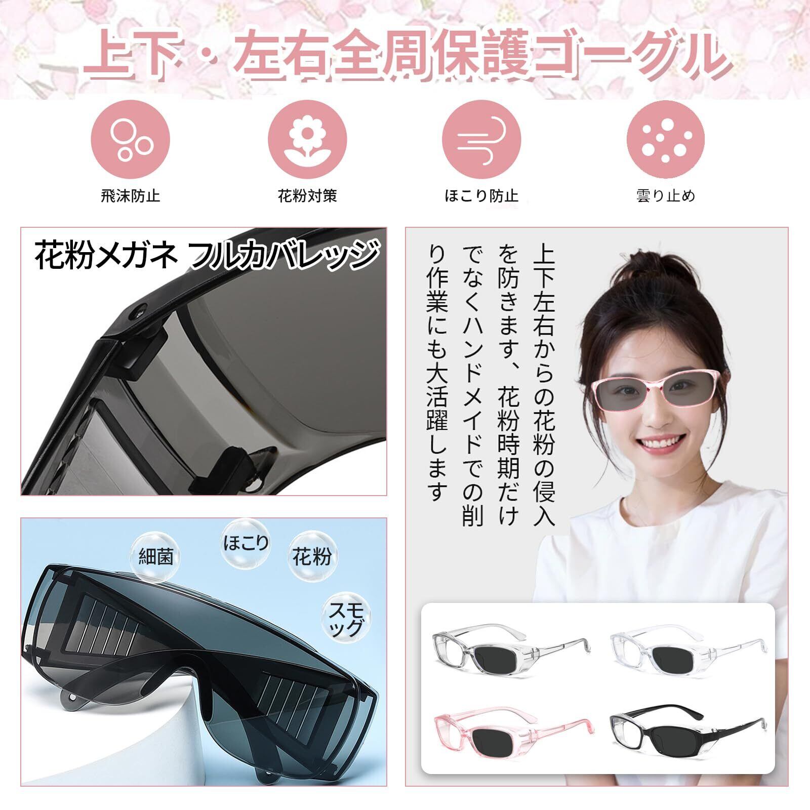 【大人用 花粉・ほこり・保護メガネ】花粉を98%以上、紫外線を99%以上、ブルーライトを35%以上カットします。大人向けに設計されています!顔にぴったりフィットする透明レンズが、メガネと顔の隙間を減らし、花粉や砂粒の侵入を防ぎます。快適な掛け心地で、花粉、砂、飛沫、ほこりから目を効果的に保護します。