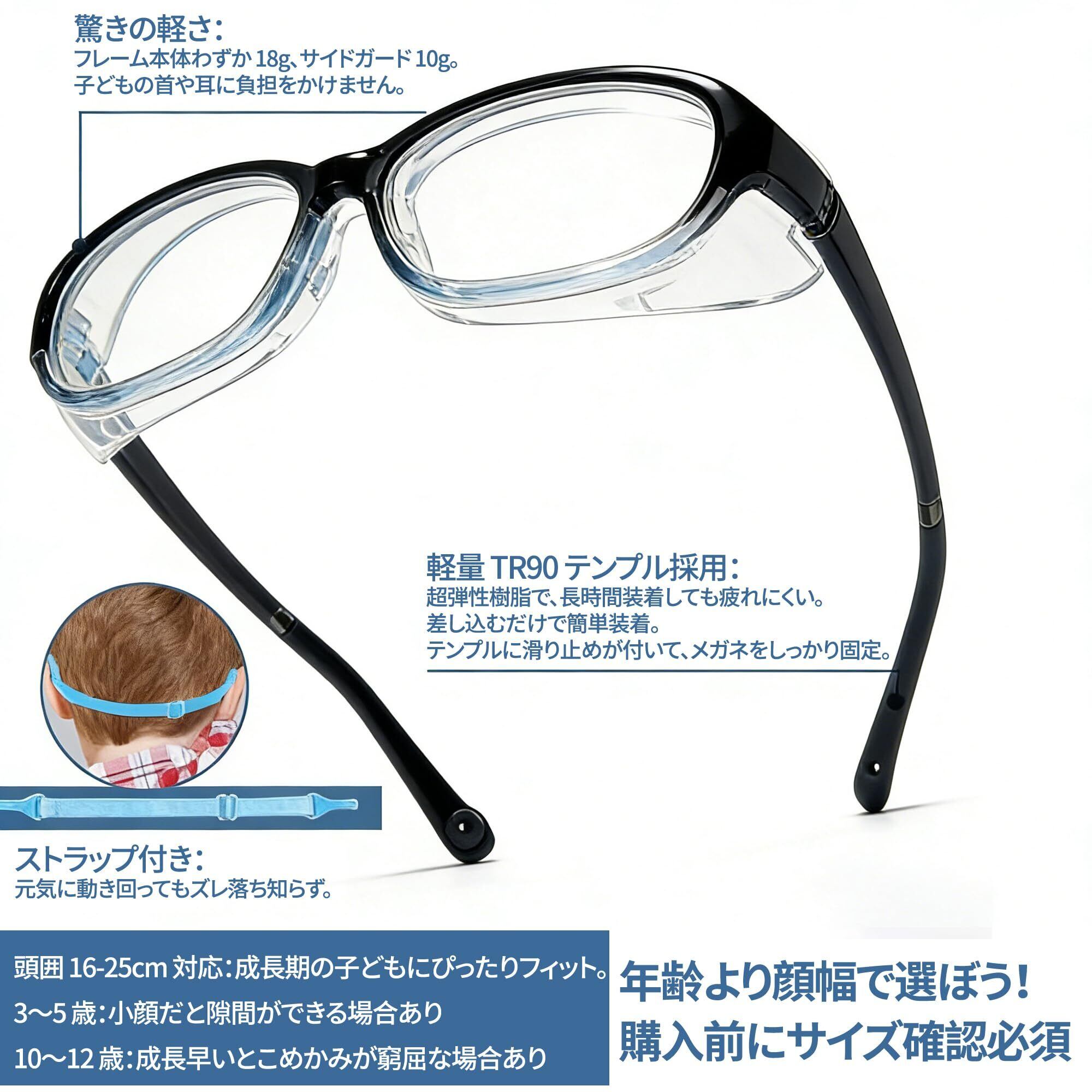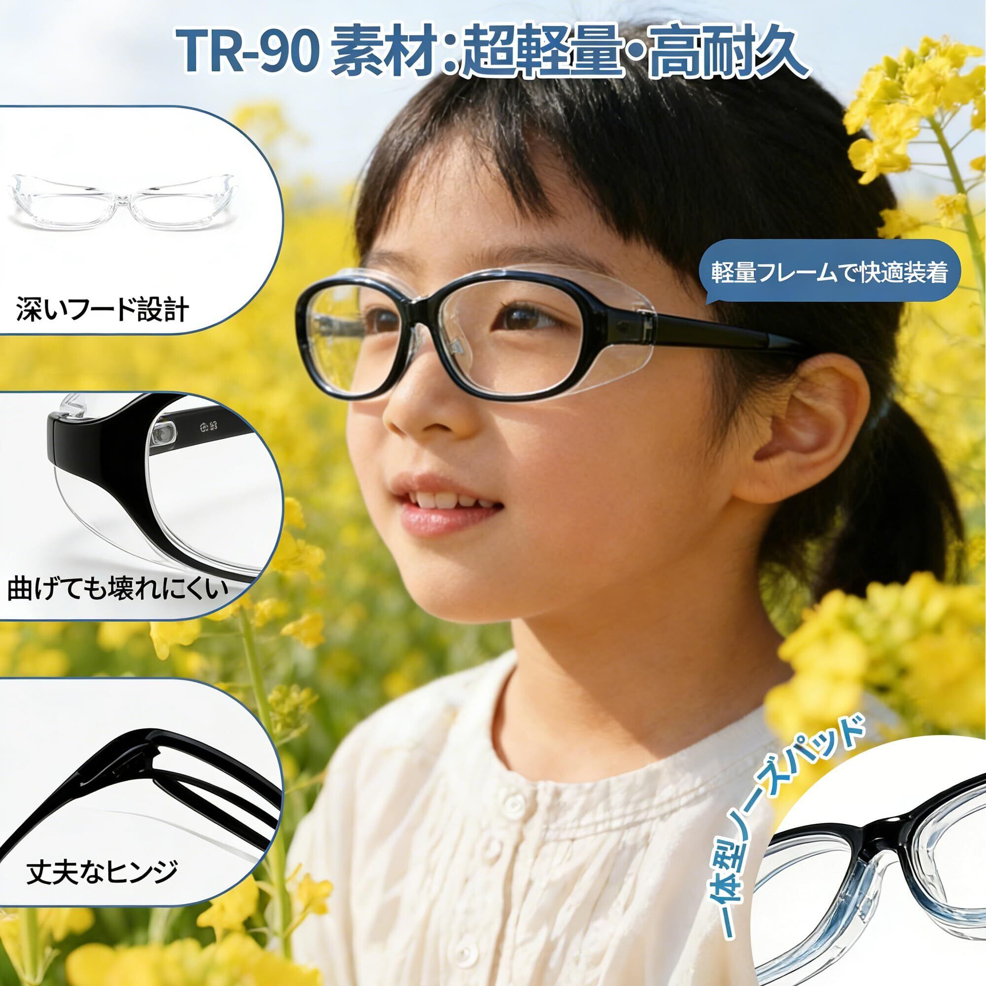 【超軽量TR90素材を採用】驚きの軽さと柔軟性! フレームには弾力性に優れた超軽量TR90素材を使用。わずか21gの軽量設計で、長時間装着しても耳や鼻が痛くなりにくい仕様です。耳に掛けるテンプル部分は自由に曲げて微調整できるため、3-12歳の幅広い年齢層にフィット。衝撃に強く折れにくいため、活発な子供の花粉 メガネとして安心してお使いいただけます。