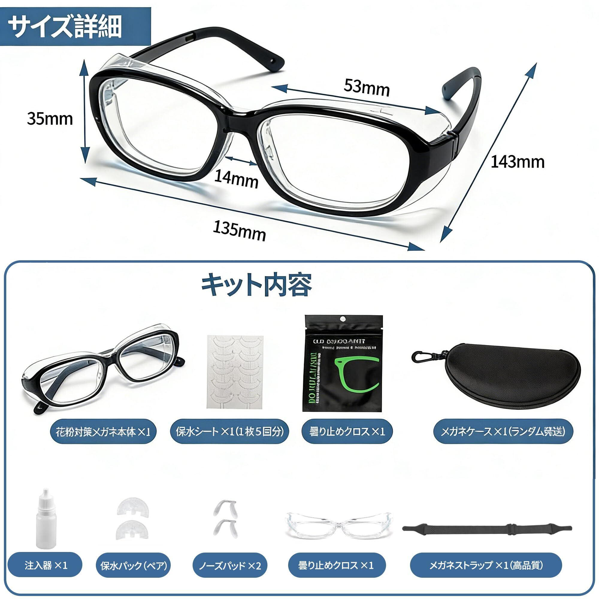 【豪華9点フルセット】届いてすぐに使える安心感 [本体、収納ケース、メガネ拭き、くもり止めクロス、ズレ防止ストッパー]の充実した9点セット。最初から全て揃っているため、買い足しの手間がありません。花粉症 メガネ 子供 小学生へのギフトとしても非常に人気です。丸ごと水洗い可能で、いつでも清潔な状態をキープできる子供用花粉症メガネです。