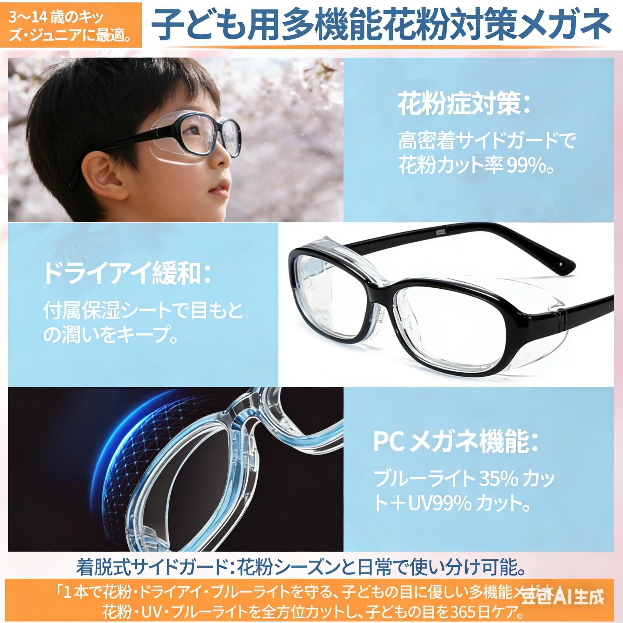 【ブルーライト&紫外線から目を守る】3WAY多機能!ブルーライトカット35%とUVカット99%機能を標準装備。花粉症シーズンは花粉 メガネ キッズとして、シーズンオフはサイドガードを取り外して「普通の伊達メガネ」や「PCメガネ」として使える3WAY仕様です。スマホやタブレット学習が多い小学生の目を保護する保護メガネとしても最適です。