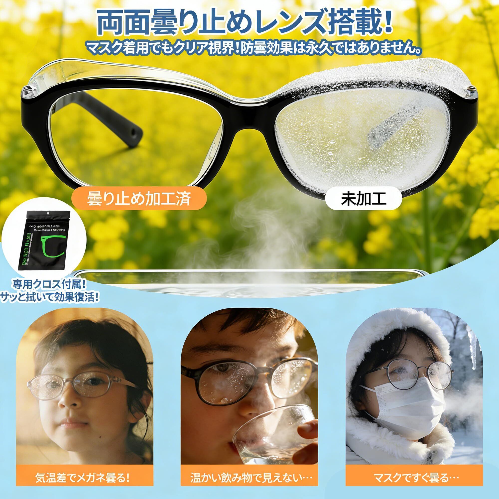 【視界を遮らない!】高性能「両面」曇り止めコート レンズの両面に高性能な曇り止め加工を施しているため、マスクを着用した状態でも曇らないクリアな視界を確保します。花粉症 ゴーグル 子供にありがちな「レンズの曇り」を解消し、通学や外遊びの際も安全・快適。付属の専用クロスでお手入れすることで、花粉対策効果を長く維持できます。