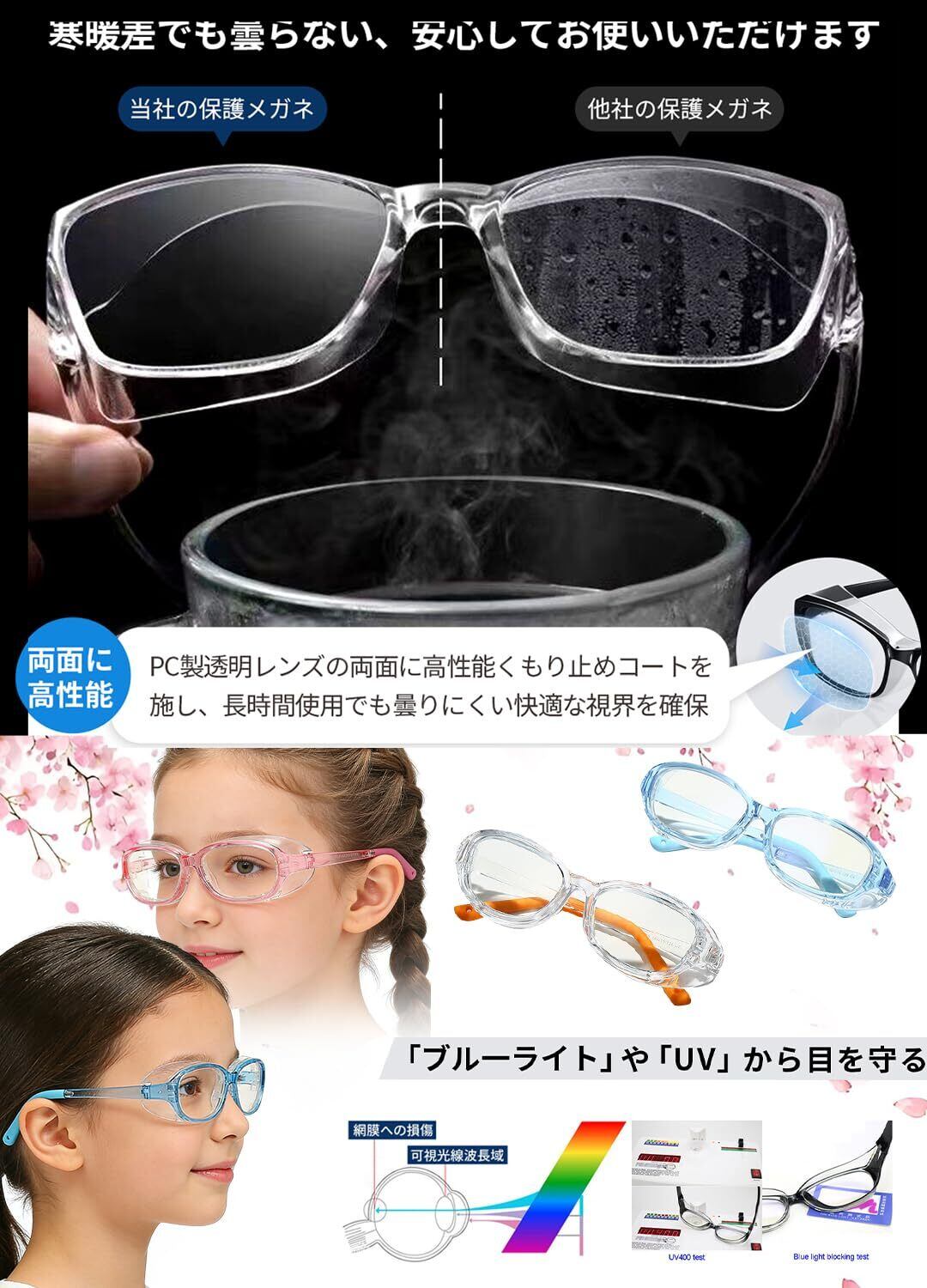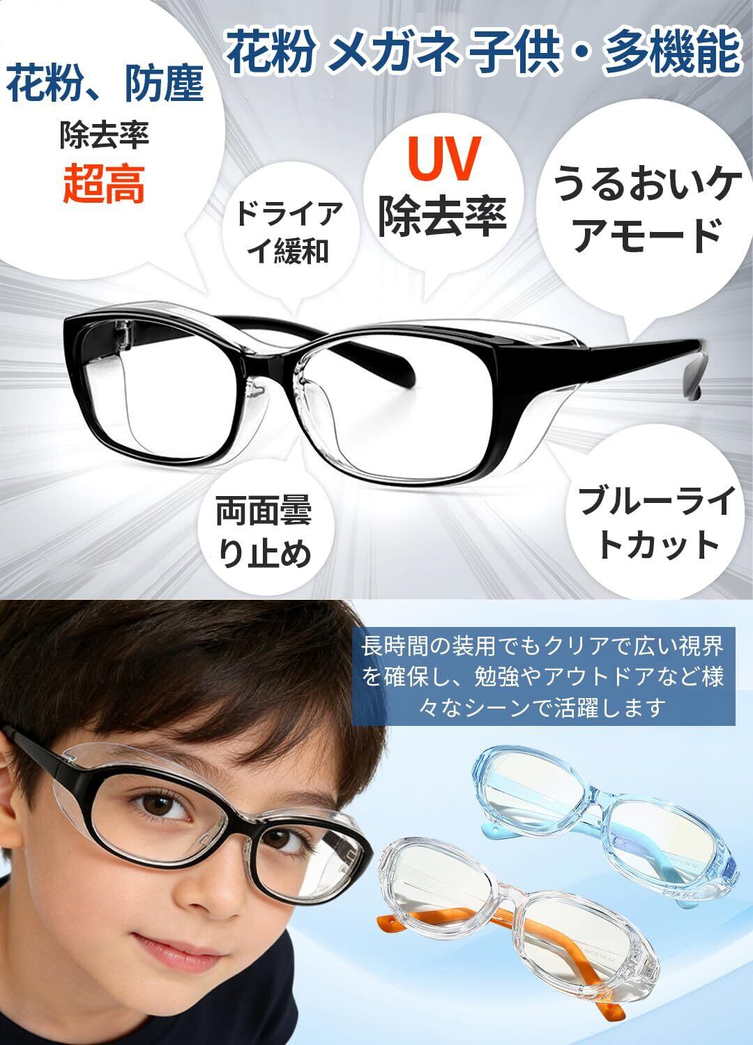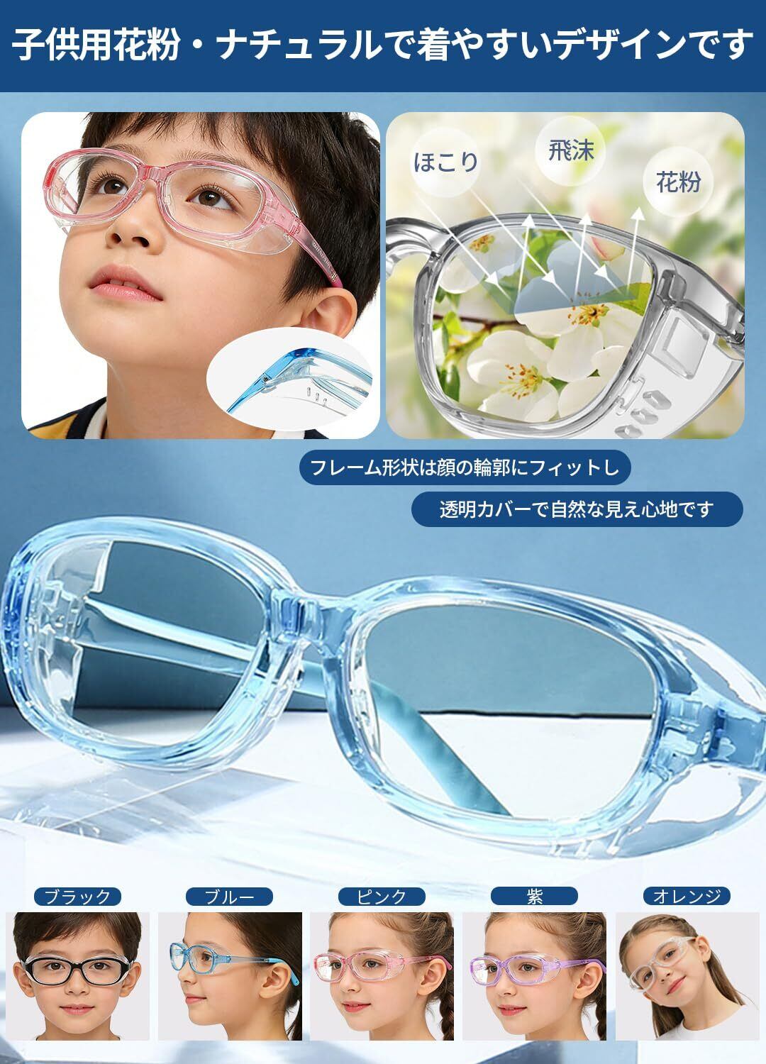 花粉 メガネ 子供 花粉症 メガネ 子供 花粉 メガネ 小学生 曇らない 両面曇り止め ブルーライトカット ドライアイ緩和 飛沫防止 防塵 紫外線対策
