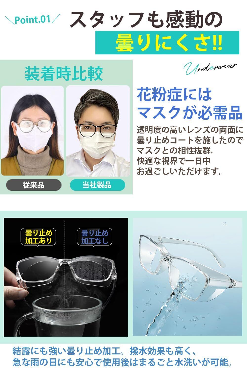【マスクをしても曇らない】花粉症にはマスクも必須アイテム。両面に特殊曇り止めコートを施した高透明レンズで、マスク着用時でも視界クリアで相性抜群!結露にも強く、急な雨の日も安心です。 使用後は水洗いが可能でいつでも清潔な状態でお使い頂けます。花粉対策