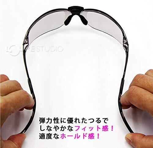 材質:フレーム・レンズ:ポリカーボネートラバー:TPR(熱可塑性樹脂) 本体サイズ:顔幅内寸約130mm(最大約140mmまで対応可)つるの長さ:約127mm