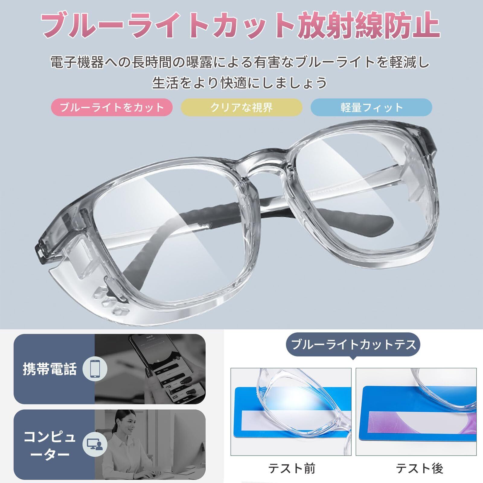 【花粉・飛沫・粉塵を99%以上カット】特殊設計の透明フードとレンズ構造により、花粉・飛沫・粉塵を99%以上ブロック。ブルーライト35%カット、UV99%カットで目を総合保護。額との隙間を最小化し、すきまからの侵入を防ぎます。