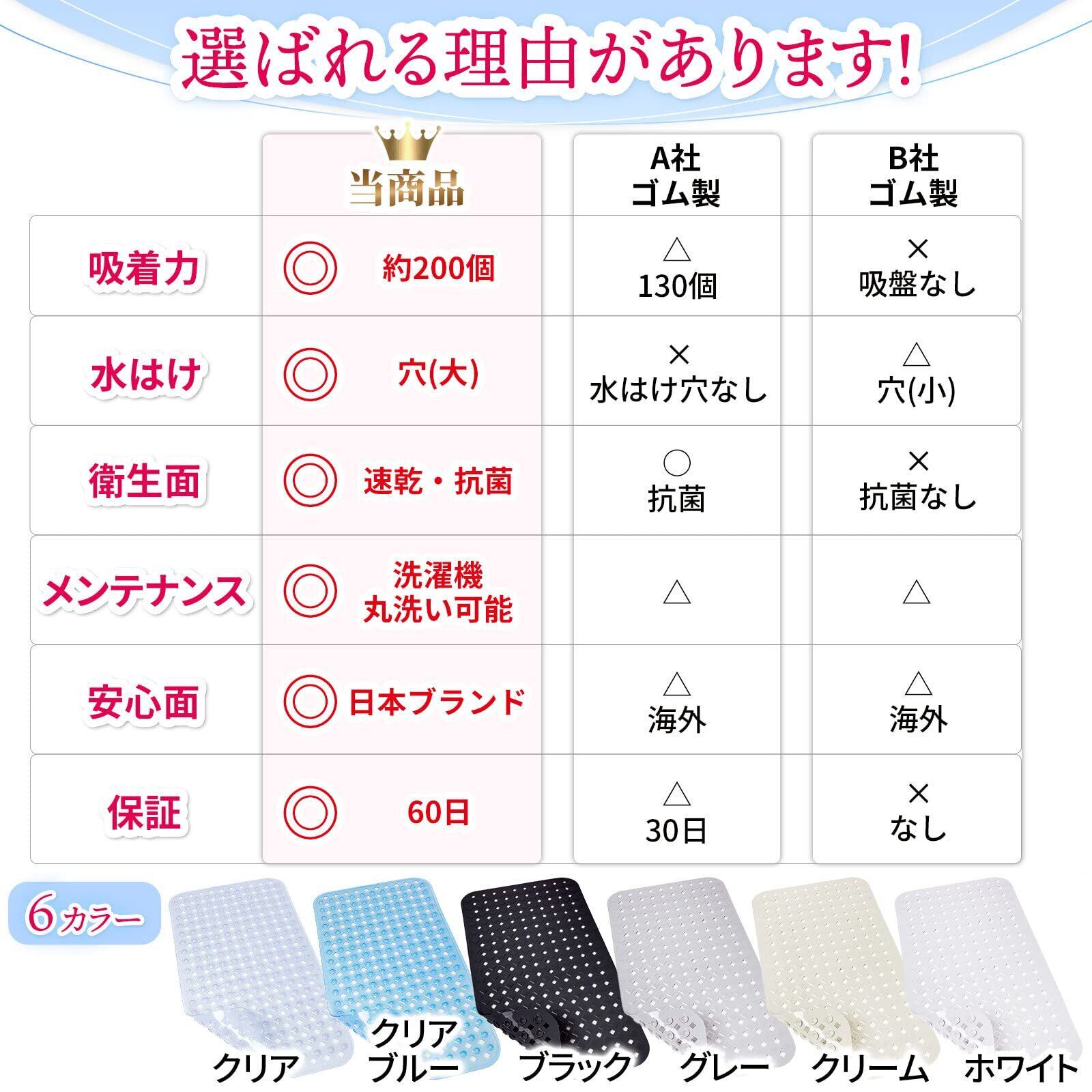 【滑り止め効果抜群たしかな吸着力】約200個の吸盤が浴槽にしっかり吸着します。突起加工とダイヤモンドの型穴があり吸着力と水はけ(抗菌)にこだわりズレたり動いたりする心配はいりません。さらにPVC製品はカビ防止効果、すべりどめ効果が抜群です。