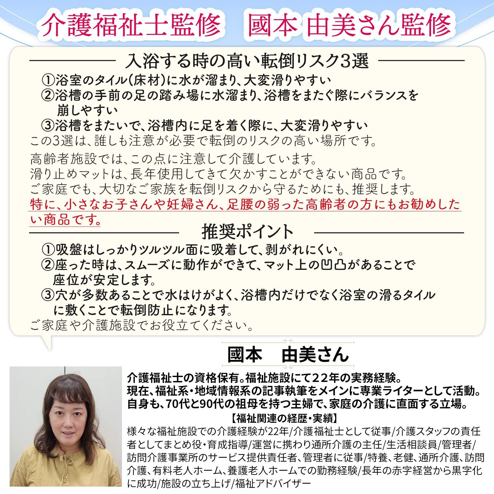【介護福祉士監修】22年介護現場で活躍されている國本由美さん監修。様々な福祉施設での介護経験を元に、実際に入浴する時の転倒リスク3選に対しての推奨ポイントをまとめていただきました。特に高齢者や妊婦さんお子様へおすすめいただいております。