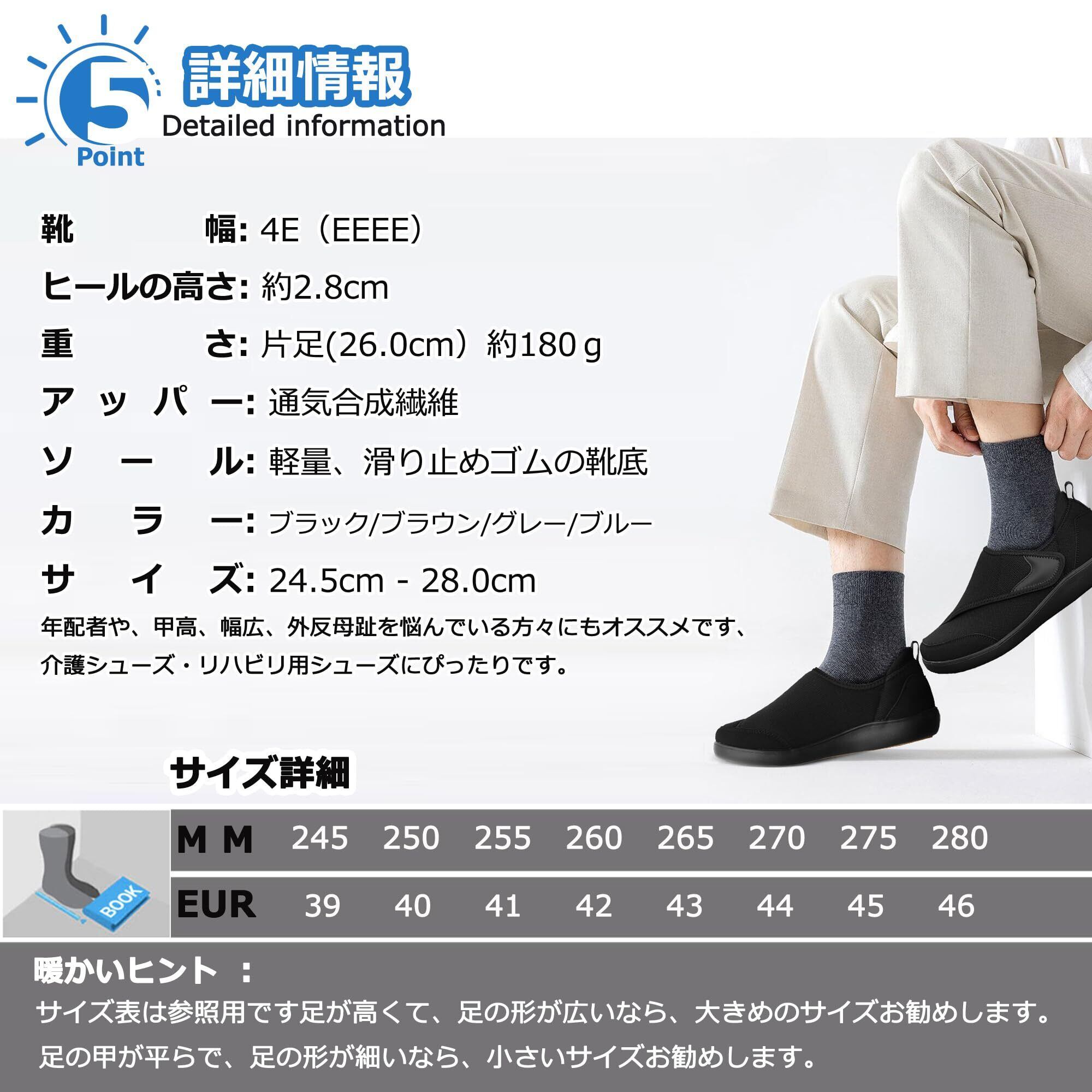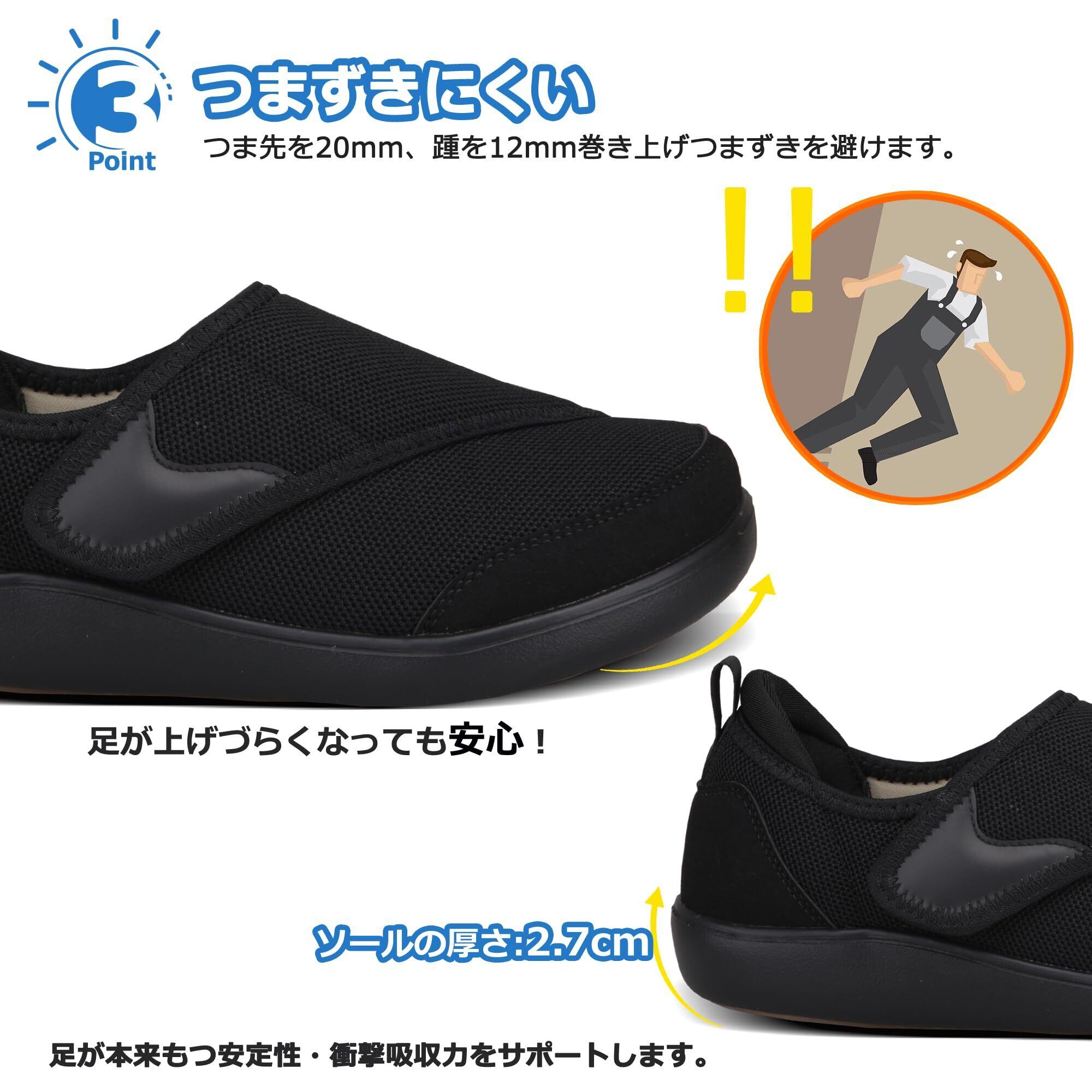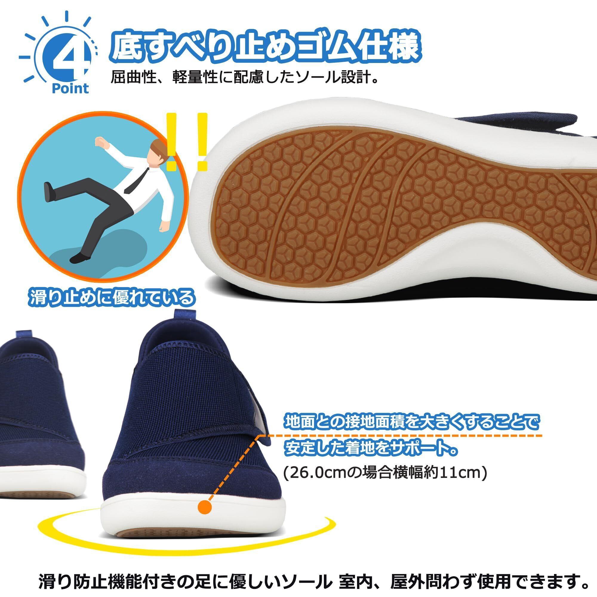 [幅広4E設計] 窮屈な締め付け感からの解放、足幅に合わせた4Eワイド形状の「介護シューズ」は、むくみや外反母趾がある方にもフィットするゆとり空間を実現。通気性の高い素材が蒸れを軽減し、介護が必要な方のデリケートな足元を優しくサポートします。