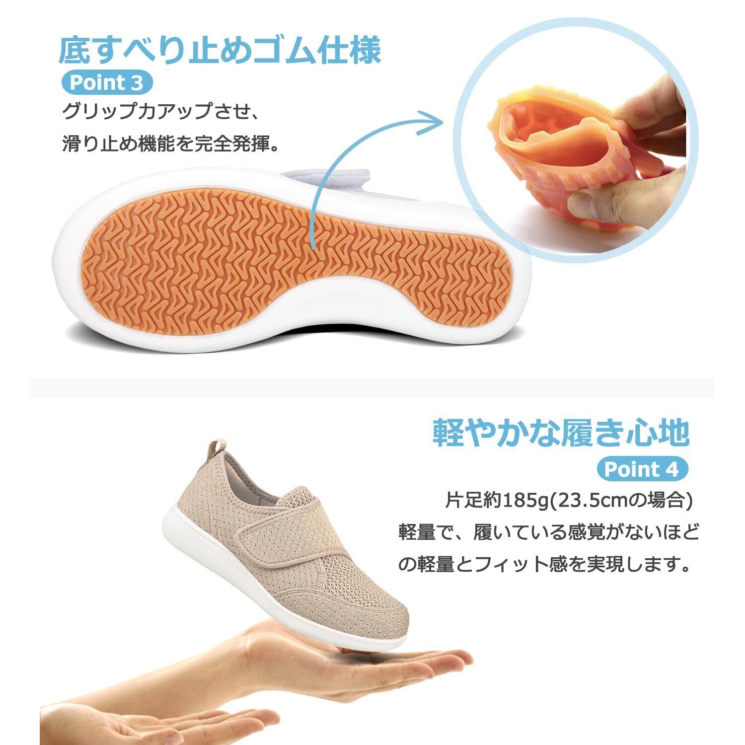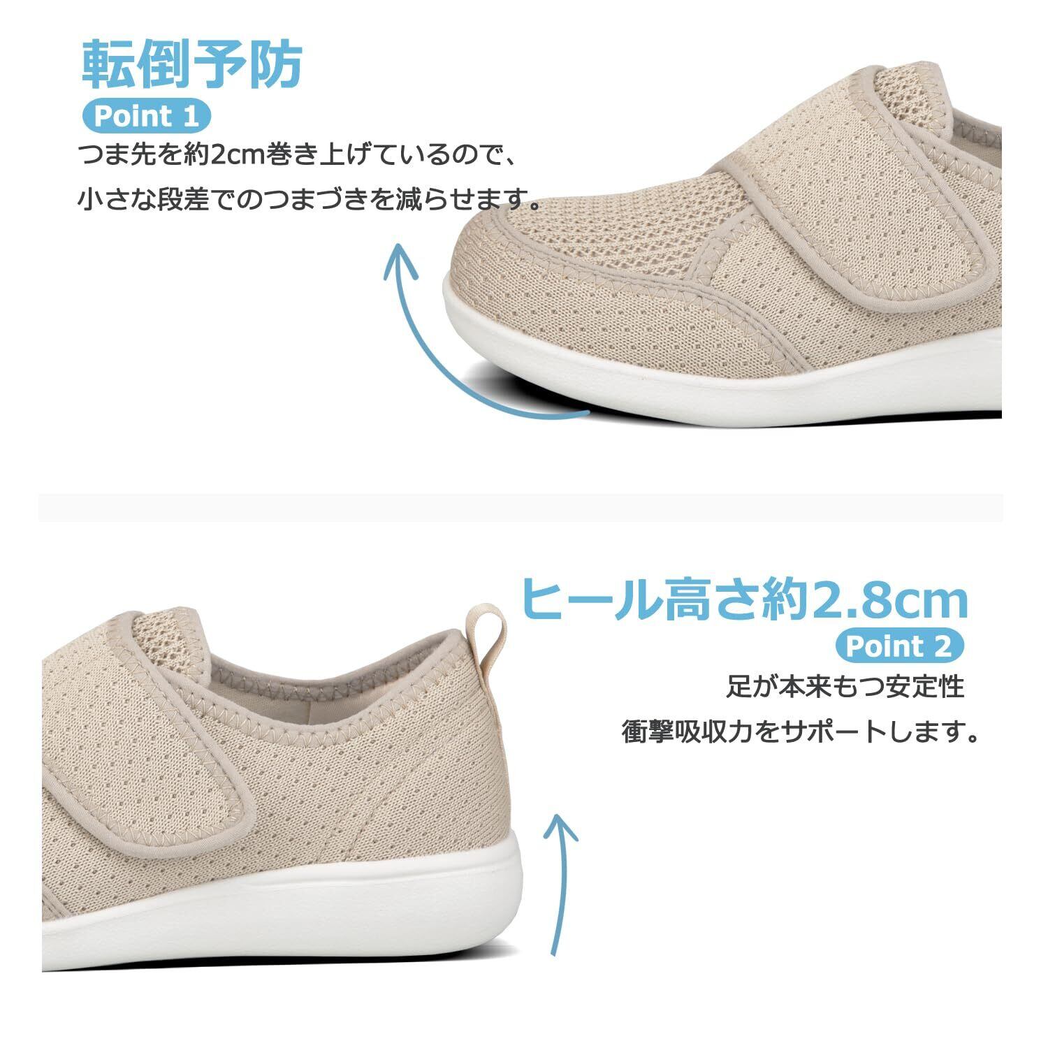 【脱ぎ履きが簡単】マジックで簡単に脱ぎ履きができます、マジックテープ仕様で着脱便利です。歩きやすさに加えて、開口部が広く、脱ぎ履きがしやすいことも特徴です。