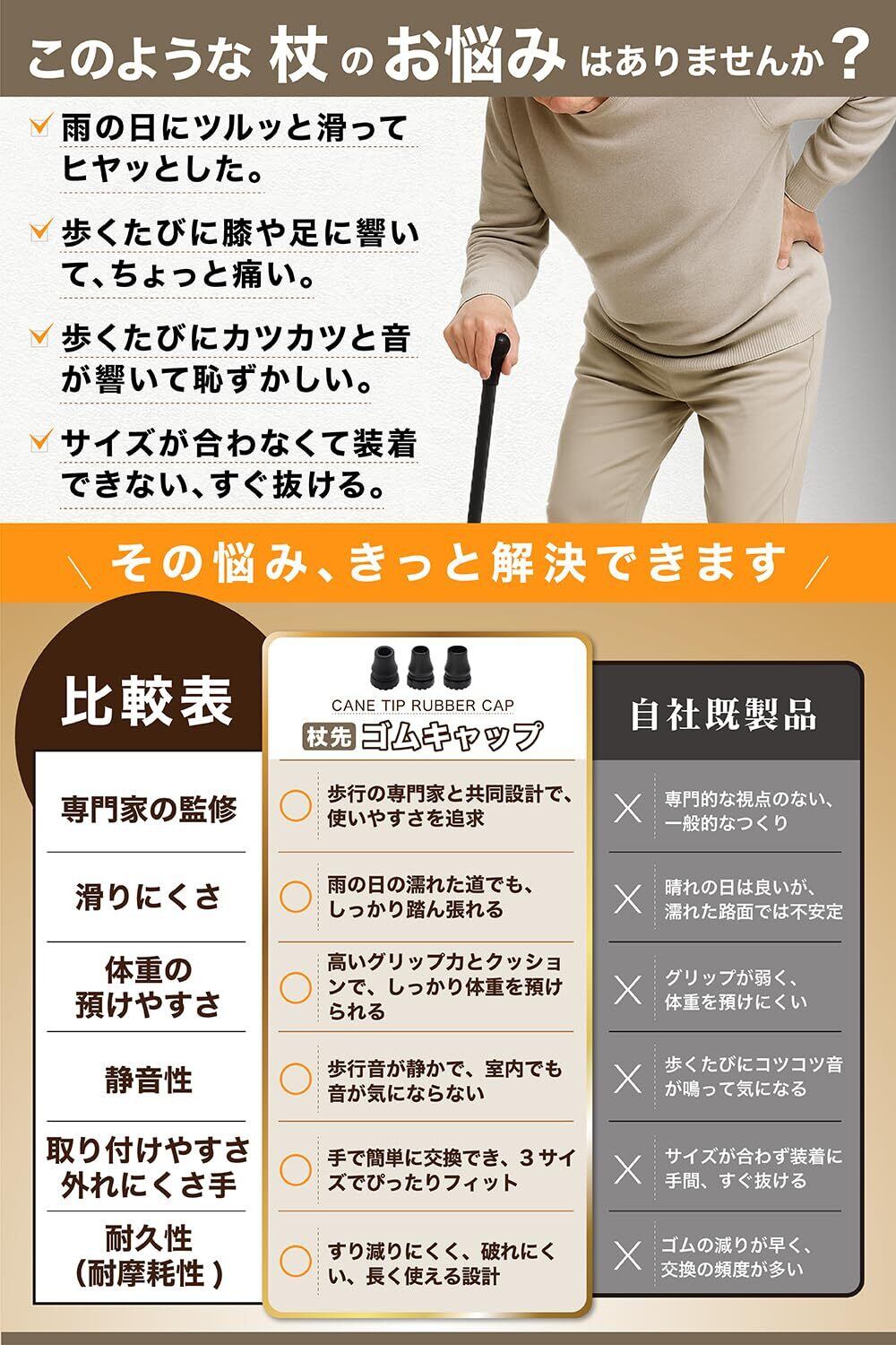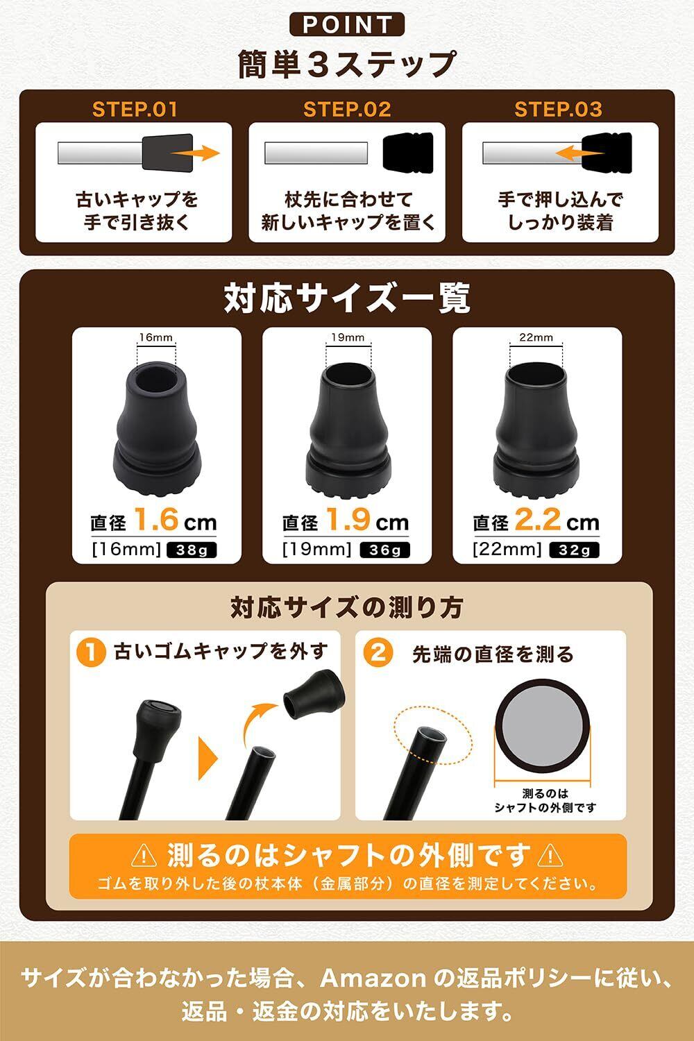 【あなたの杖にぴったり合う、3サイズ展開 + 返品・交換対応】直径1.6cm・1.9cm・2.2cm(16mm・19mm・22mm)の3サイズをご用意。市販されている多くの杖に対応しており、やわらかい素材で取り付けも簡単です。「自分の杖に合うか不安…」という方もご安心ください。万が一サイズが合わなかった場合は、の返品ポリシーに従い、返品・交換の対応をいたします。サイズ選びに迷っても安心してお試しいただけます。