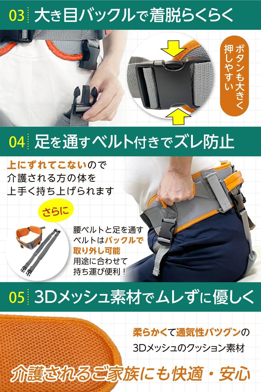 ・【足を通すベルト付き】ズレ防止、上にずれてこないので介護されるかたの体を上手く持ち上げられます。