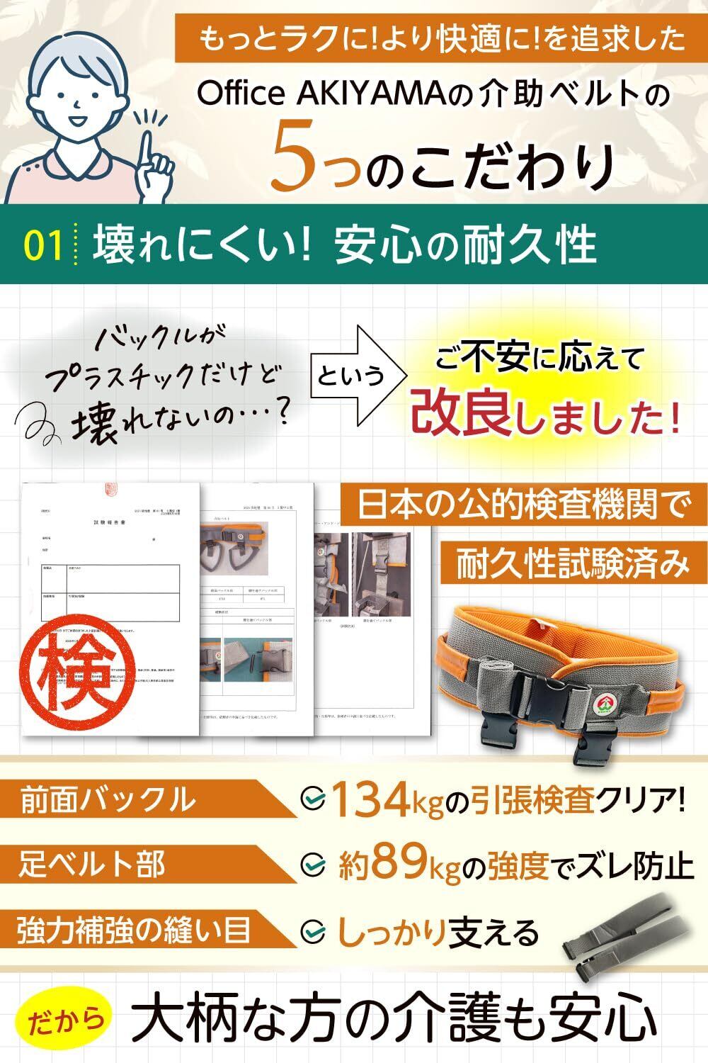 ・【看護師監修】本製品は看護師監修のもと開発され、安心・安全性に特にこだわって設計されています。介助ベルトは前面バックルと足部バックルは日本の公的機関で耐久性検査済み壊れにくい安心の耐久性、日本のメーカーが丁寧に企画・開発しました。品質の安全を大切にしたいあなたにぴったりです。