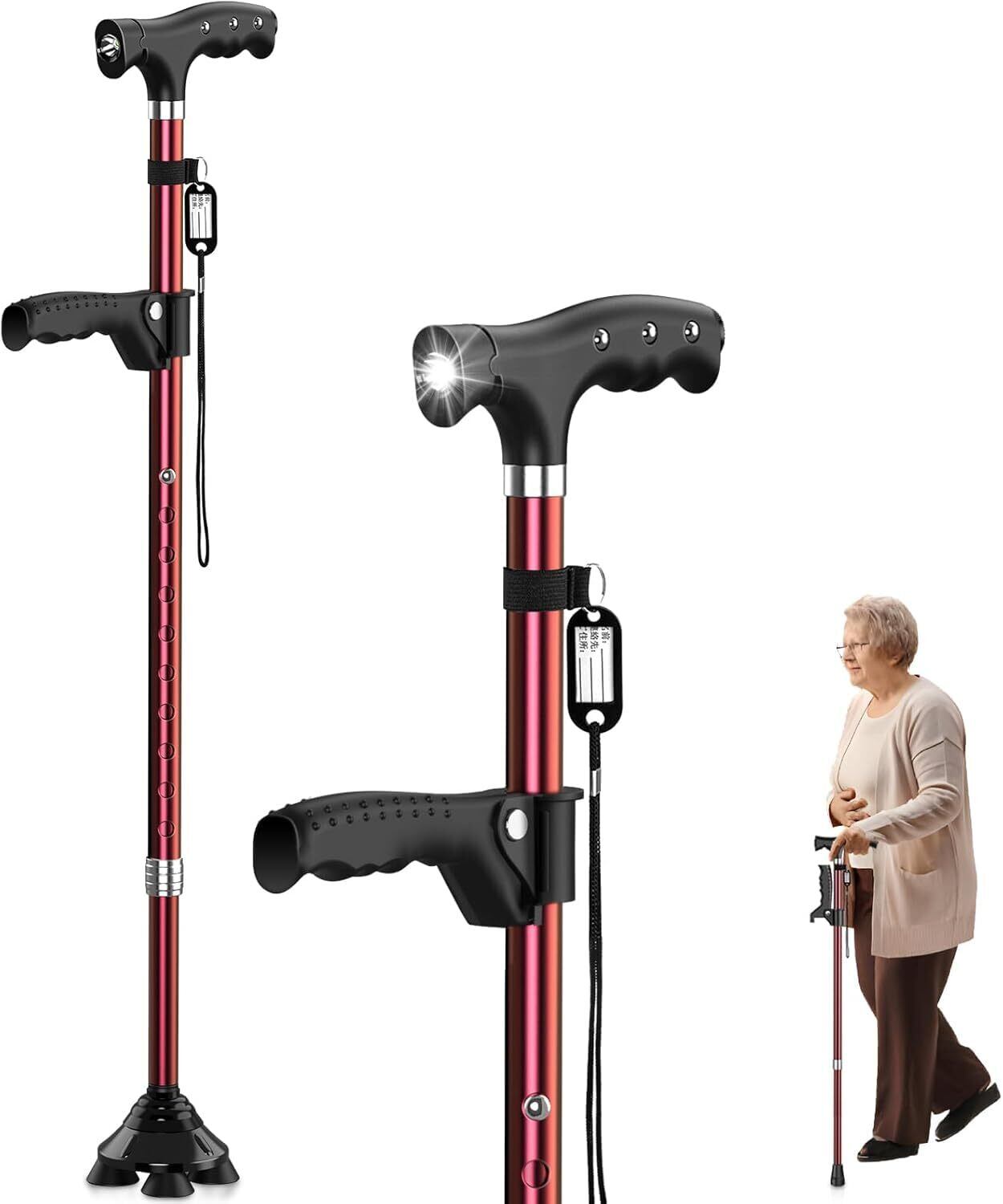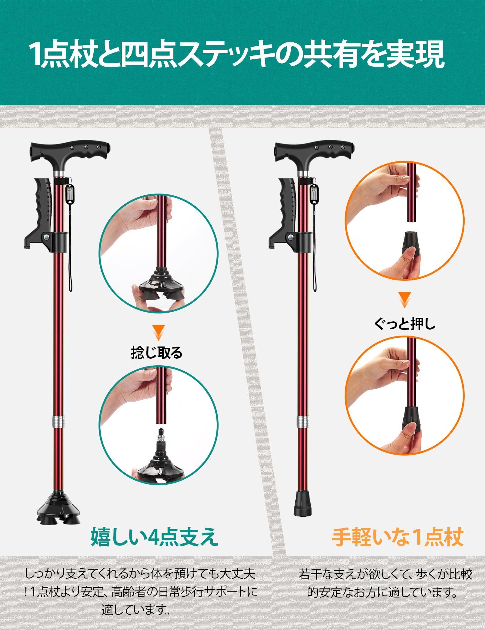 ステッキ 杖 倒れない 自立式4点杖 男女兼用 クレバーケーン伸縮式 軽量アルミ製 長さ調節可能 補助ハンドル付き 介護用 歩行補助杖 LEDライト搭載 夜間散歩対応 日本語説明書付き 高齢者の歩行サポート 松葉杖 敬老の日・母の日・父の日プレゼント 日本語説明書付き ブラック/レッド