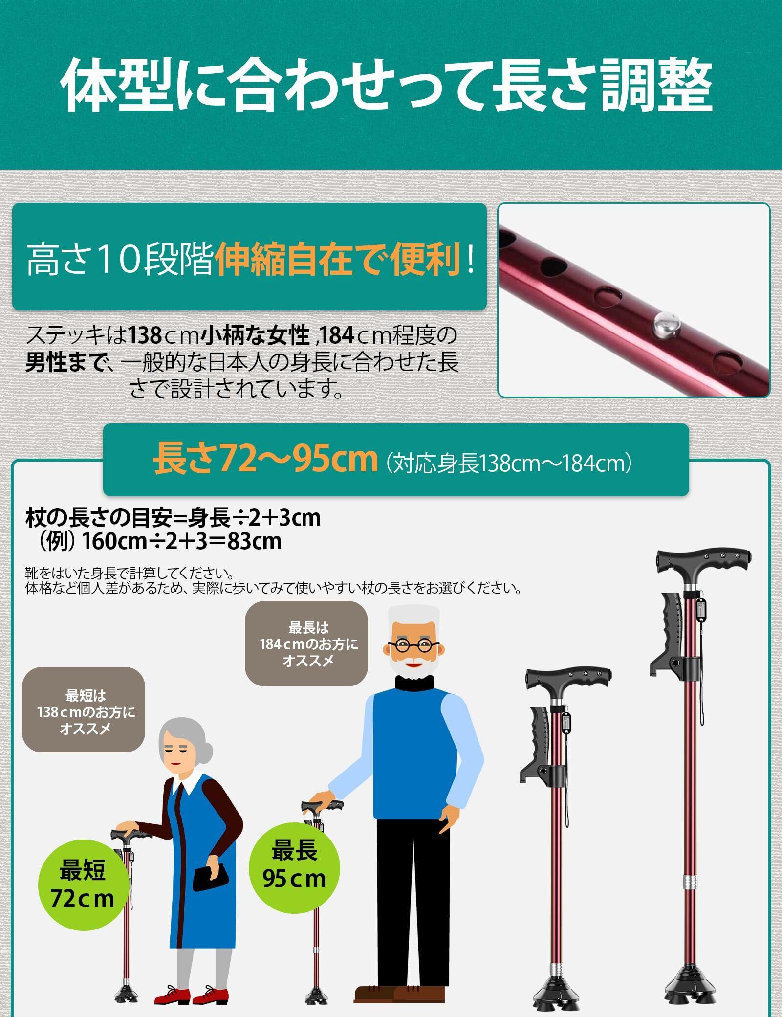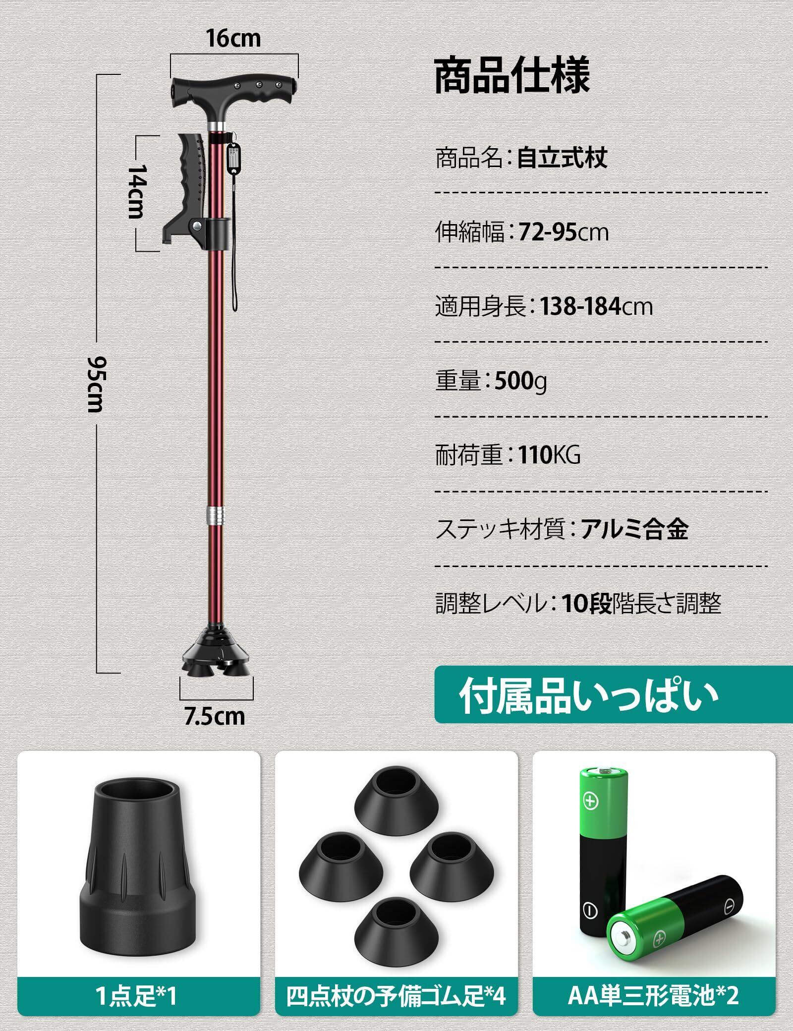 親にプレゼントにピッタリ:この立ち上がり楽々アルミ製4点杖は高齢者への介護に、母の日・父の日・敬老の日等にプレゼントをとしてはぴったりです。【パッケージ】折りたたみ杖x1、電池x2、日本語説明書x1 。期間内に万が一問題がありましたら、ご遠慮なく当社まで連絡してください。