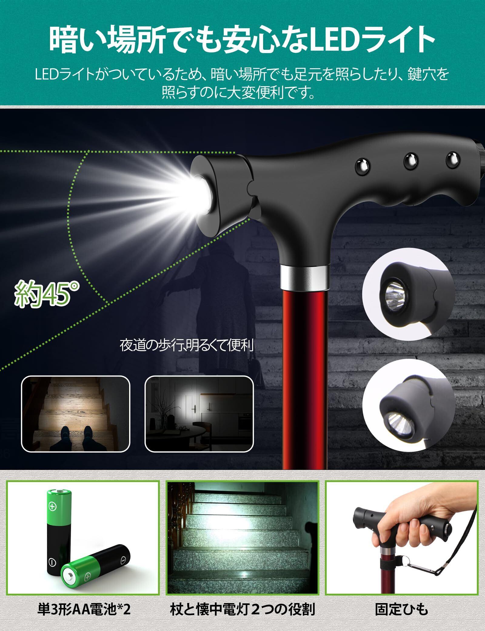 暗い夜道を照らす、LED伸縮式歩き杖:LEDライトがついているから薄暗い夜道や夜のトイレでも明るく道を照らしてくれます。杖の長さは72~95cmまで調整可能、黒と赤二色の選択もあり、身長138~185センチの紳士と女性に適しています。また、アルミニウム合金製の軽量タイプで、丈夫で長持ちし、高齢者が持ってもそれほど負担になりませんですのため、日常散歩、旅行、介護補助などに大活躍です。