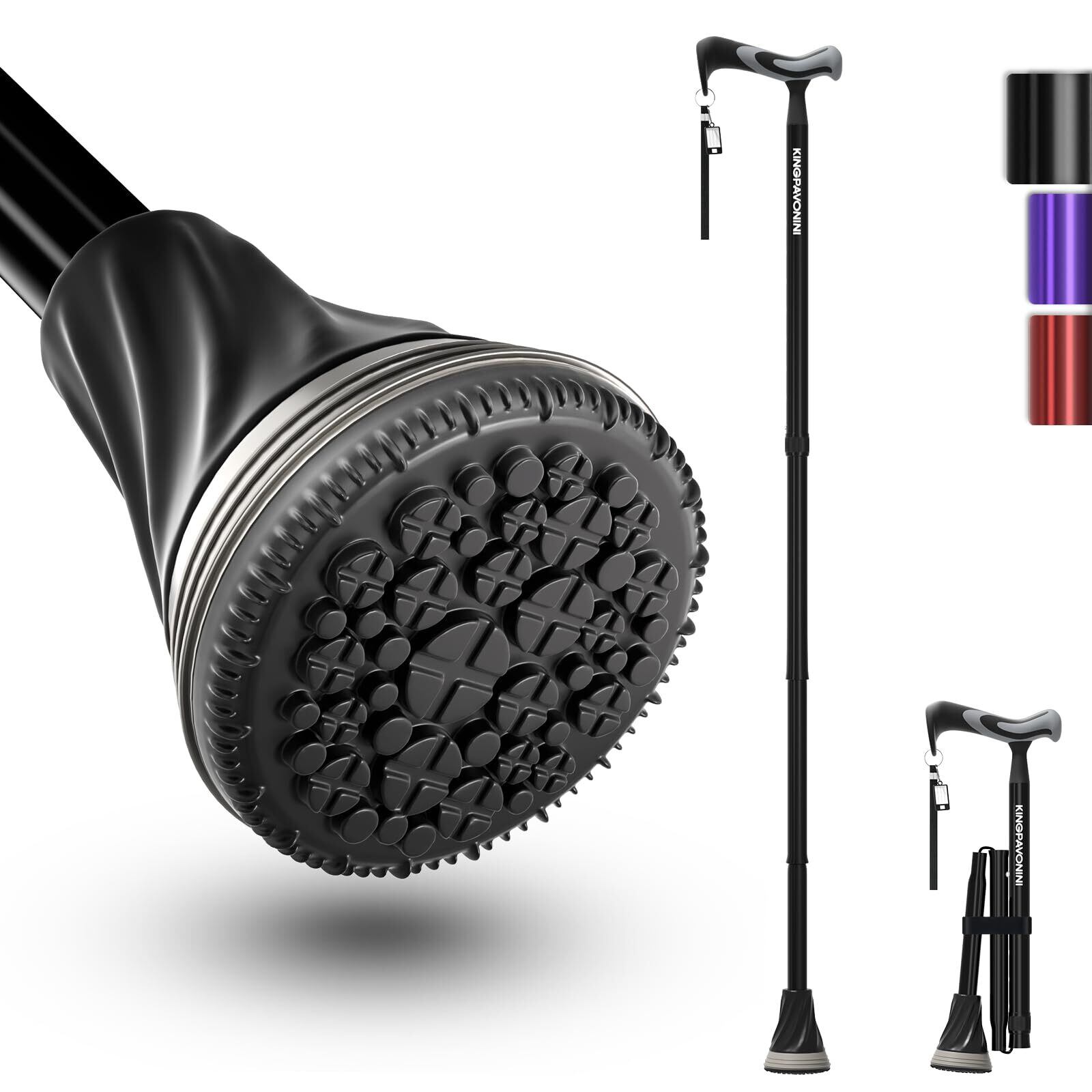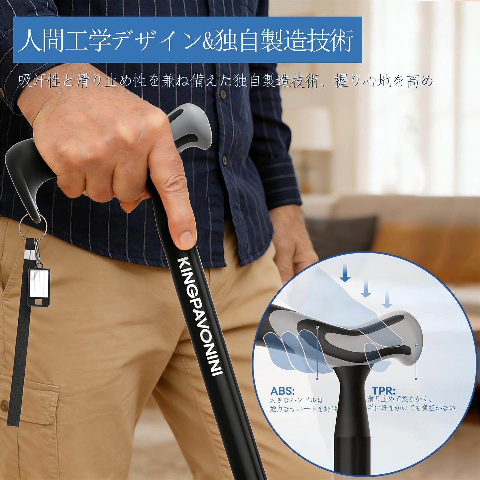 【人間工学に基づいた滑り止めハンドル】KingPavoniniの調節可能な杖の人間工学に基づいたハンドルは、ABS素材で作られており、サポートを強化します。柔らかく柔軟なTPR素材は、握り心地がよく、滑りにくいので、手のひらの疲労と圧力を軽減します。しっかりとしたグリップ感と一日中快適な使い心地を提供します。