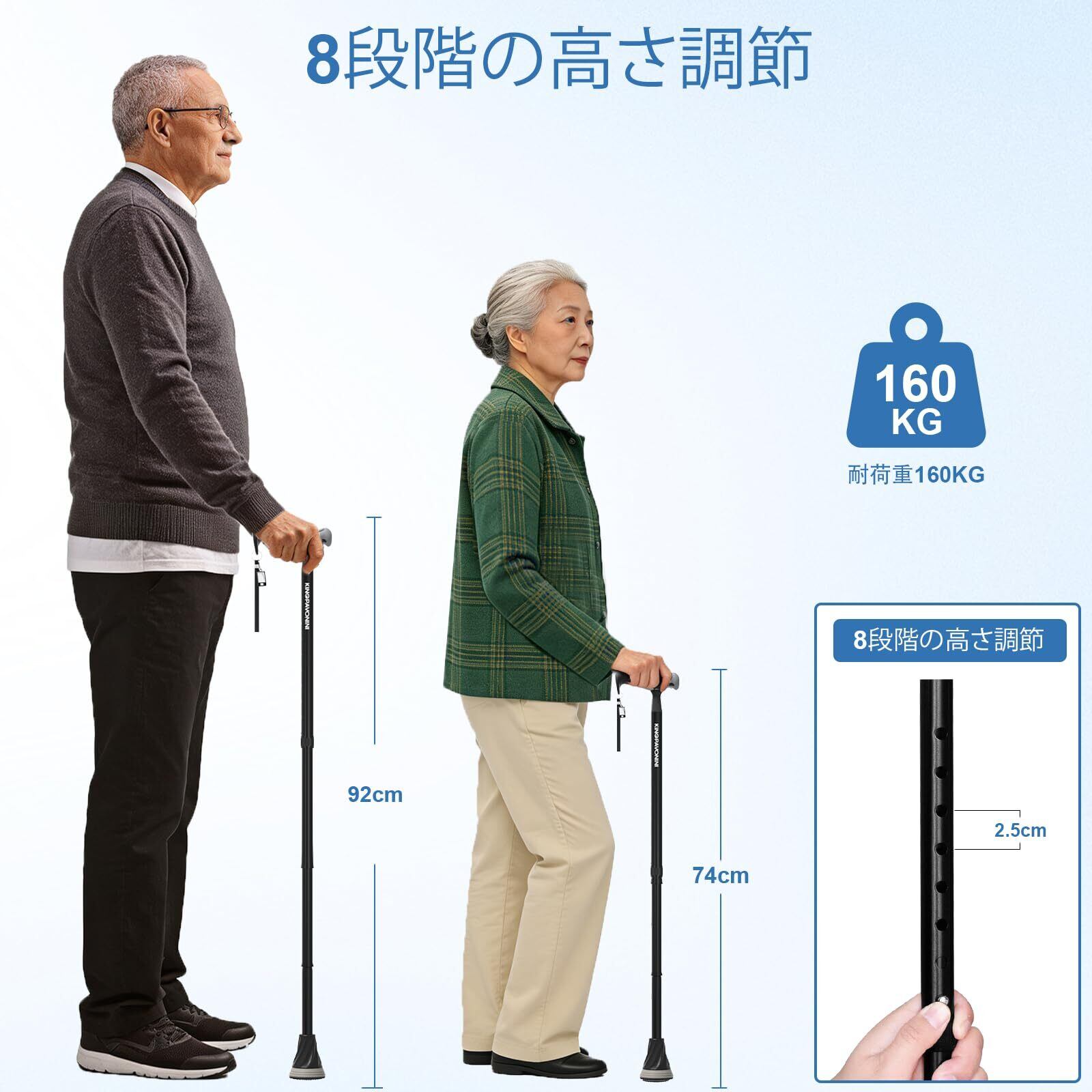 KingPavoniniは人間工学ハンドルステッキ最大8つの調整可能な高さです。148cmから188cmまでの人々に合わせて調整可能な杖を手直しします。ほとんどすべての高齢者、ユーザーの身長に合った適切な高さに杖を簡単に調整できます。 杖自体の調整範囲は 72cm -96cmです。