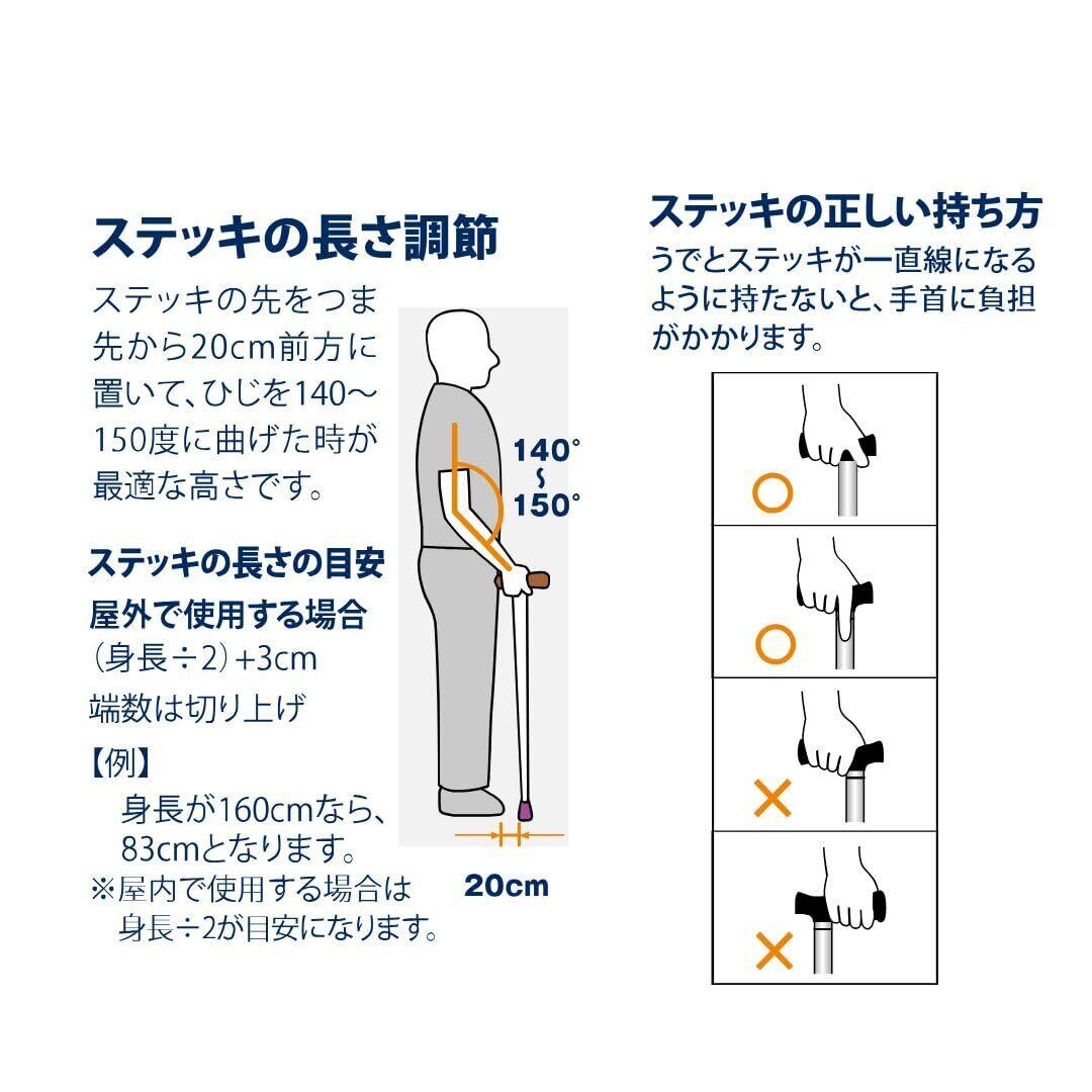 初めての方にオススメ ●スタンダードでリーズナブルな杖 ●適応身長目安:約140~185cm ●サイズ:約73.0~95.5㎝・10段階(2.5cmピッチ) ●シャフト径:手元22㎜、杖先19㎜ ●使用替えゴム:19㎜用 ●重量:約320g