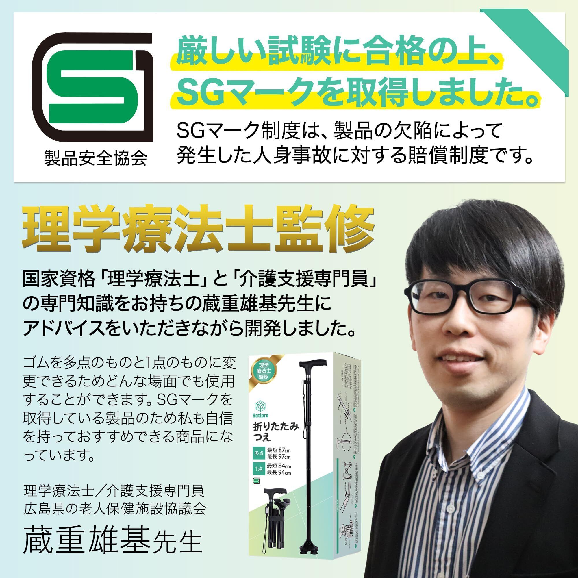 【理学療法士監修】国家資格である理学療法士の蔵重雄基先生監修の元、商品化した折りたたみ杖。理学療法士、介護支援専門員の専門知識を持つ蔵重雄基先生からのアドバイスを受けながら、安全で使いやすいつえを目指しました。