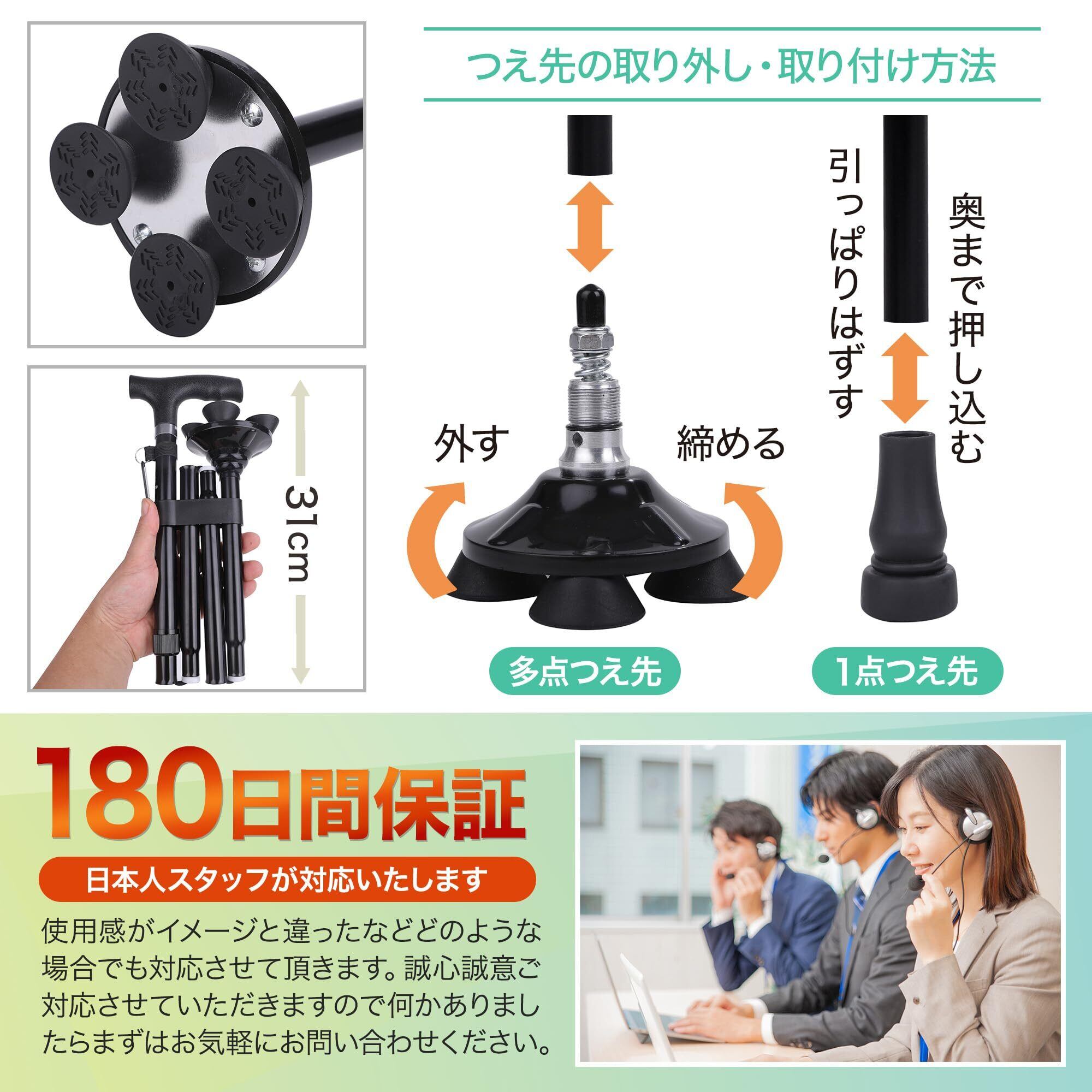 【商品仕様】○多点つえ長さ:87cm~97cm ○1点つえ長さ:84cm~94cm ○調整:それぞれ5段階で調整可能 ○折りたたみ時サイズ:長さ31cm、幅13cm ○重量:多点つえ435g、1点つえ318g ○素材:グリップ:PP(ポリプロピレン)、シャフト:アルミ、杖先ゴム:TPR(熱可塑性ゴム) ○お届け内容:つえ本体、ゴム先(多点用×4、1点用×1)、予備ゴム先(多点用×4、1点用×1)、日本語説明書 ○発売元:Satipro <180日間>使用感が違ったなどどのような場合でも誠心誠意ご対応させていただきます。何かありましたら、まずはお気軽にお問い合わせください。