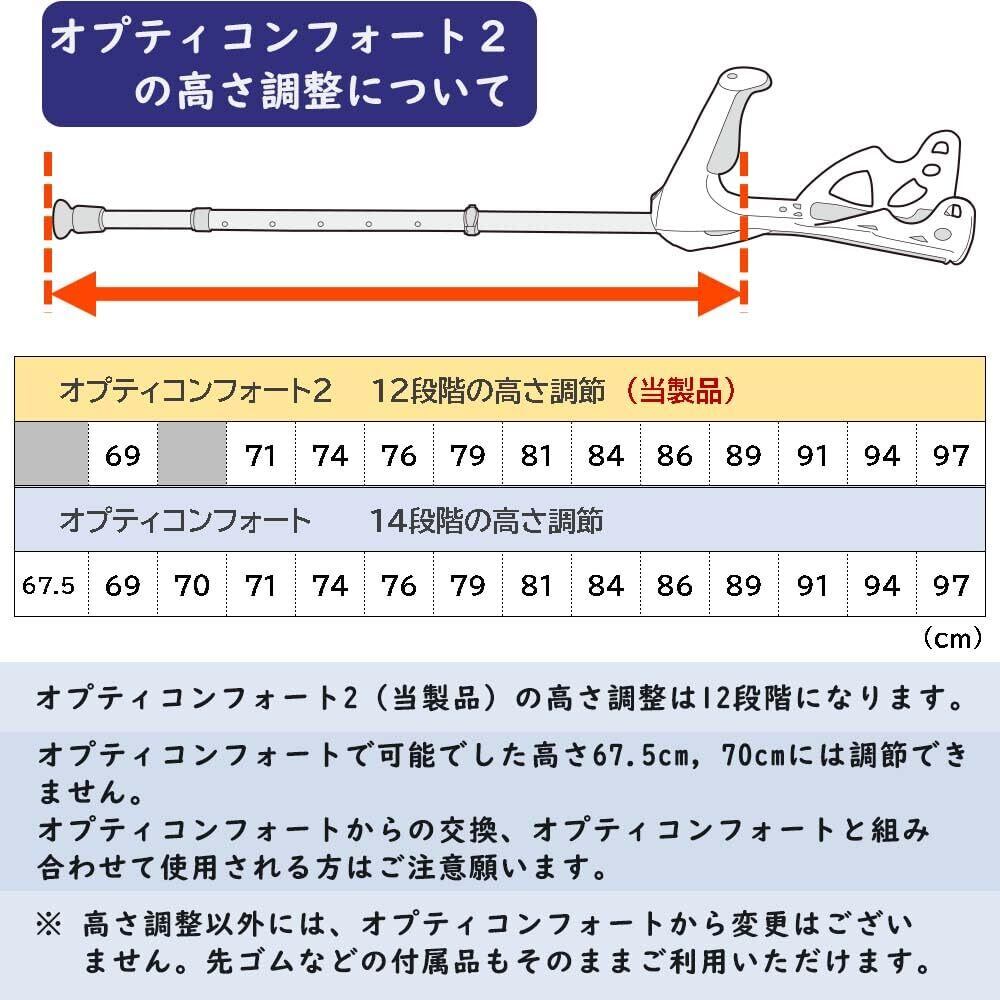 [12段階の高さ調整]グリップから杖先までの長さ:69/71/74/76/79/81/84/86/89/91/94/97(cm)※ 数値は計る箇所により多少の誤差がございます。※ オプティコンフォートにあった 高さ67.5cm,70cm は調整できなくなりました。オプティコンフォートからの交換、オプティコンフォートと組み合わせて使用される方はご注意願います