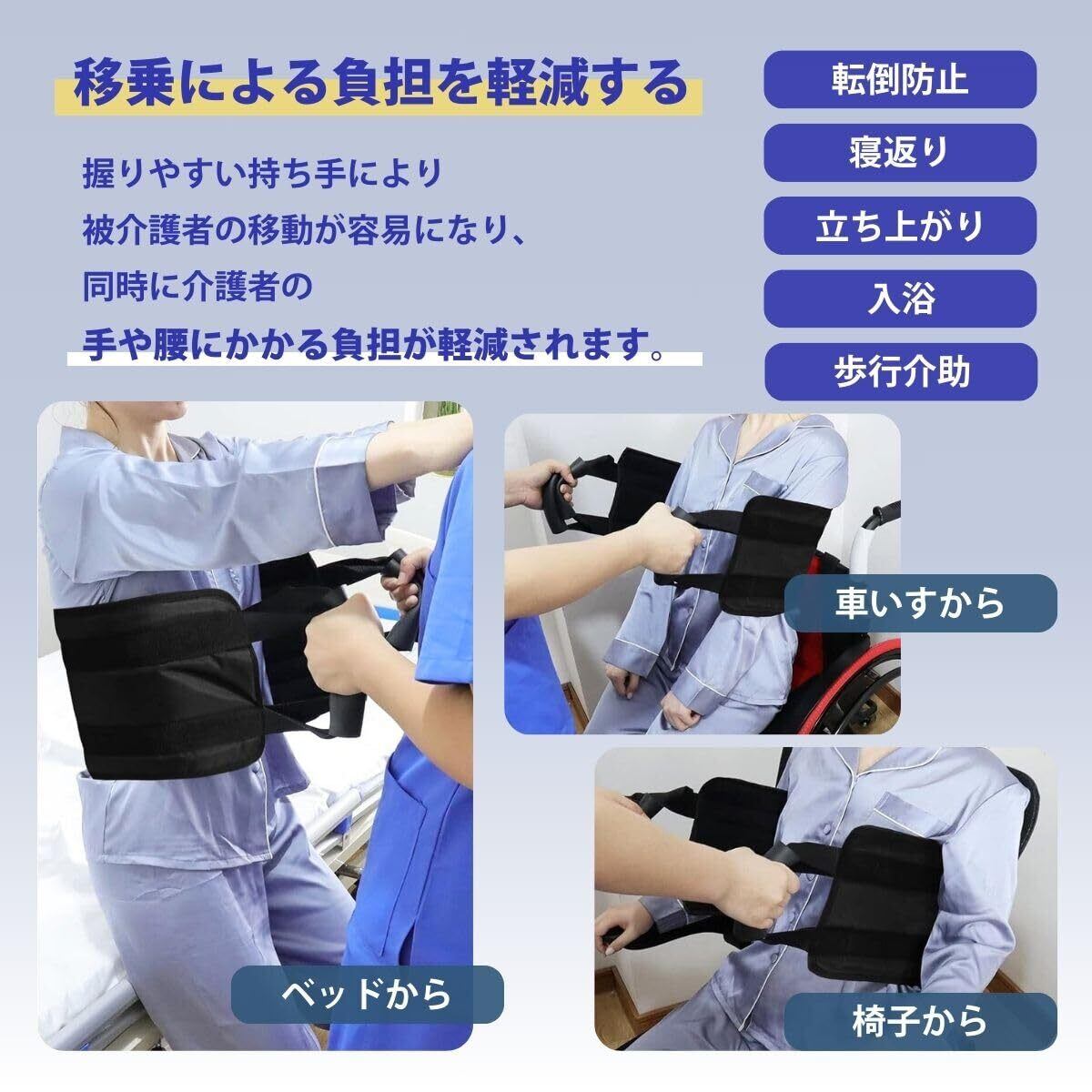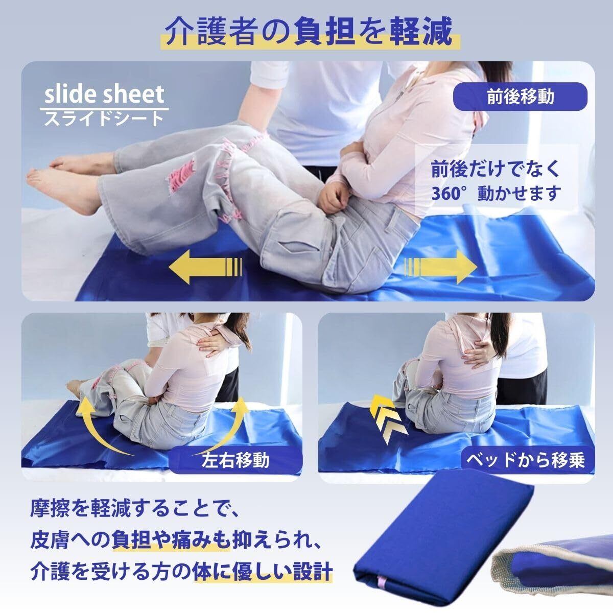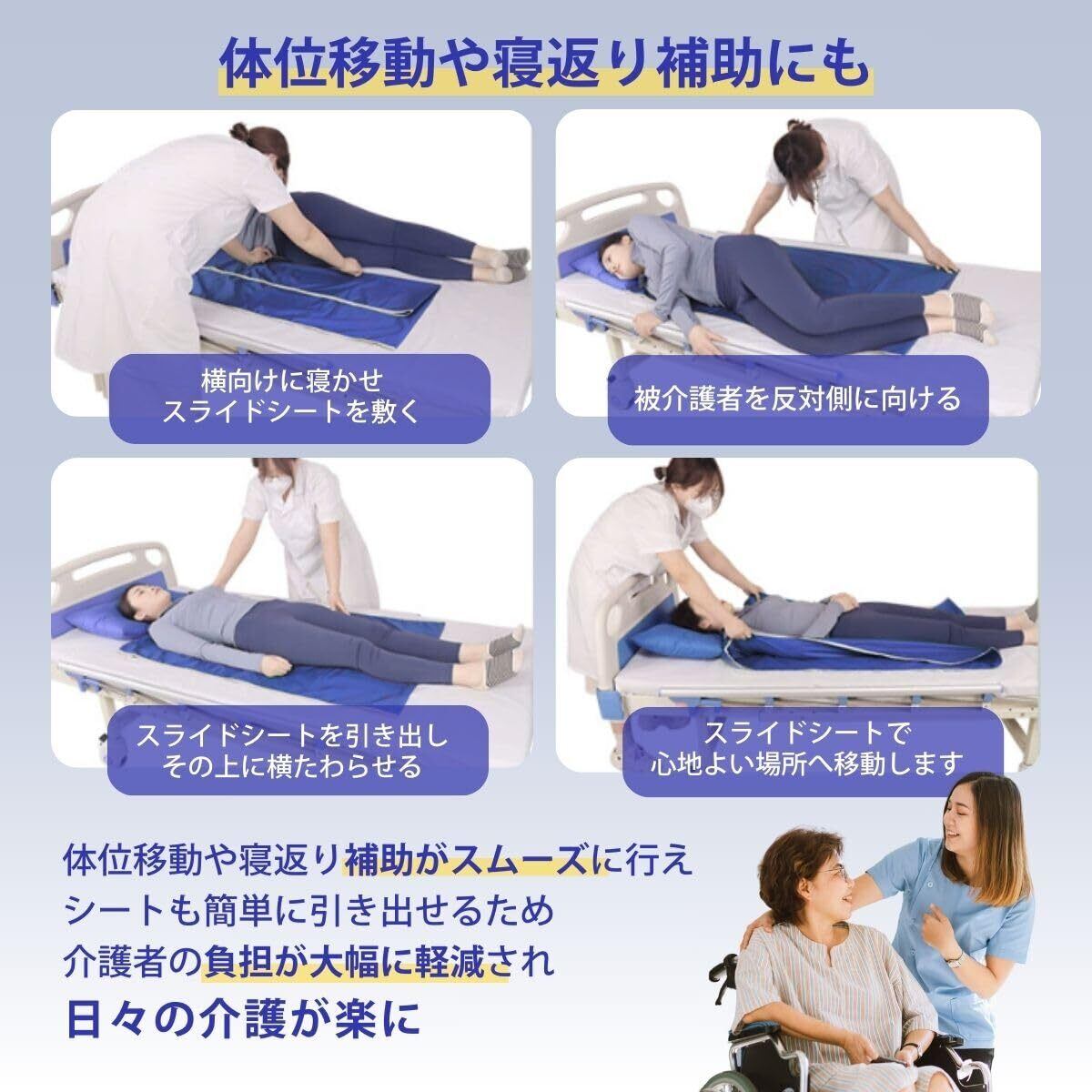 【介護をもっと効率的に!時間短縮・作業軽減で介護者も楽に】 従来の移乗介助と比較して、力を入れずに身体を回転・スライドさせられるため、無理なく介助可能です。高齢のご家族を自宅で介護している方はもちろん、介護職の方にも嬉しい機能が満載です。 洗濯機での丸洗いも可能なため、常に清潔な状態を保ちやすく、感染対策にも有効です。使いやすさと耐久性を兼ね備えた、長く使える介護サポートアイテムです。