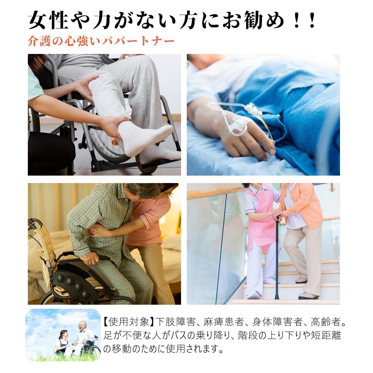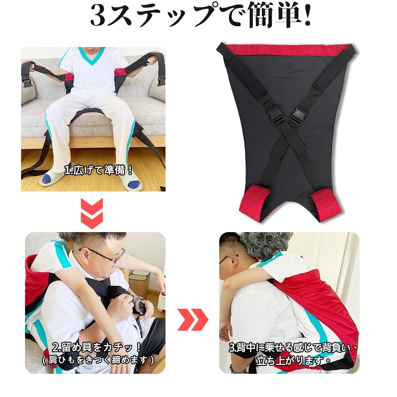 【ひとりで運べる!両手も自由】両手が使えるので階段も安全に搬送。麻痺患者、足が不便な人、高齢者にの階段の乗降、電車や車とバスの乗り降り、ベッドの移動、短距離の移動。背負う方も背負われる方ももっと安全、快適、楽に移動!