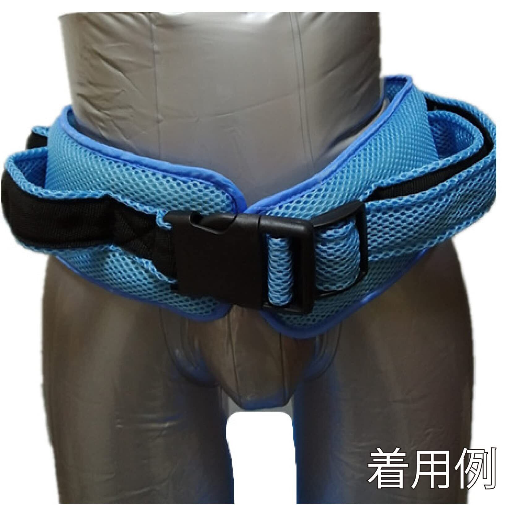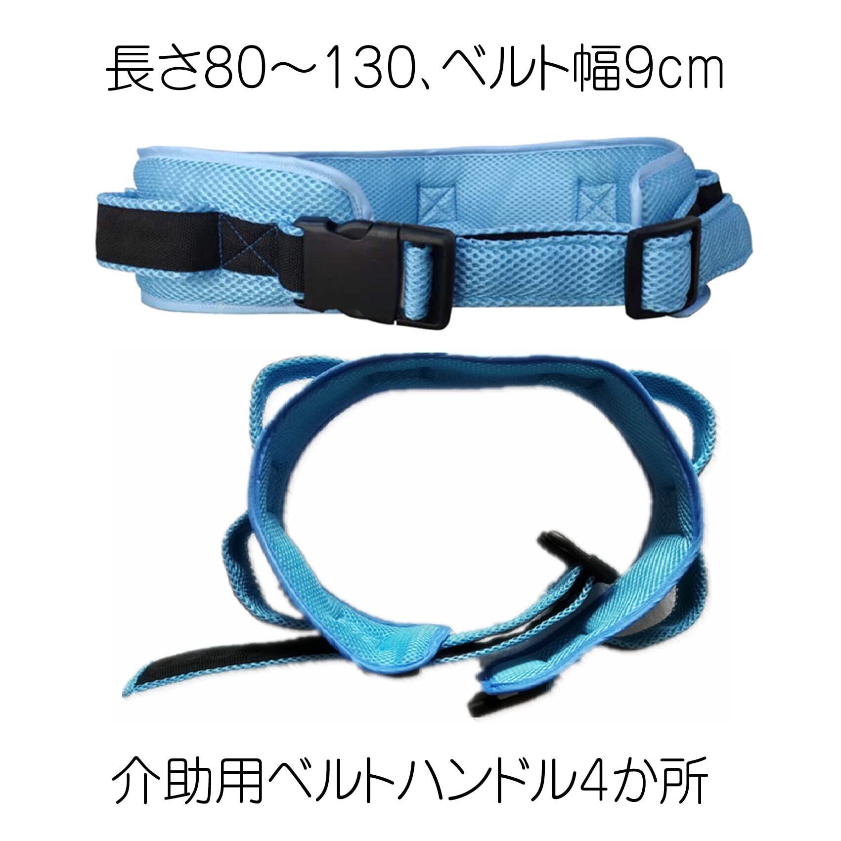 介護用腰ベルトは、プラスチックのバックル付き、腰回り80~130cmまで調整可能。蒸れにくい通気性の良いメッシュ、クッション性の高いウレタン製。介護者は被介護者が装着したベルトの後方のハンドル部分を握って支えます。