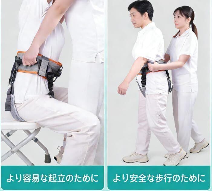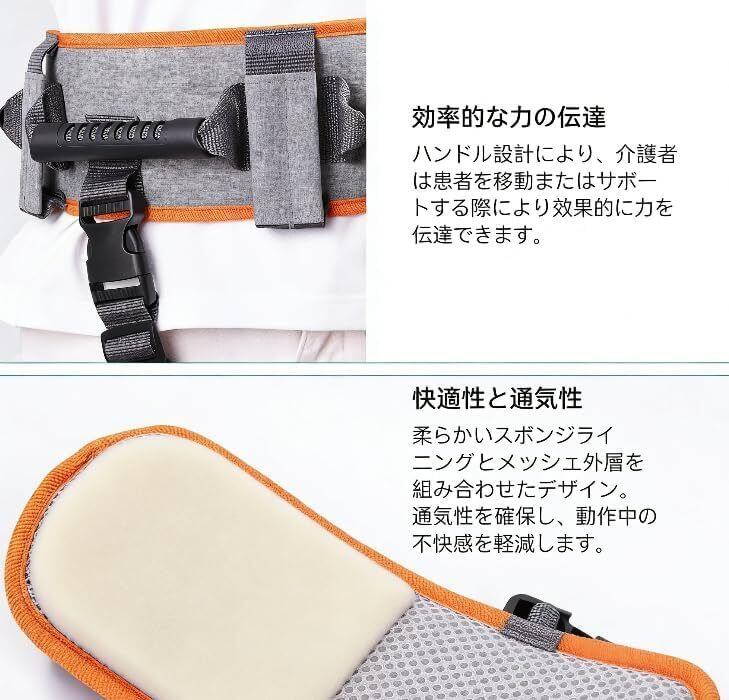【介護者の腰への負担を最大40%軽減】この移乗ベルトは、ユーザーを安全に支えながら介助者のリフト動作を補助する設計です。利用者を持ち上げる際の腰への負担を大幅に軽減し、介護作業の身体的ストレスを軽減します
