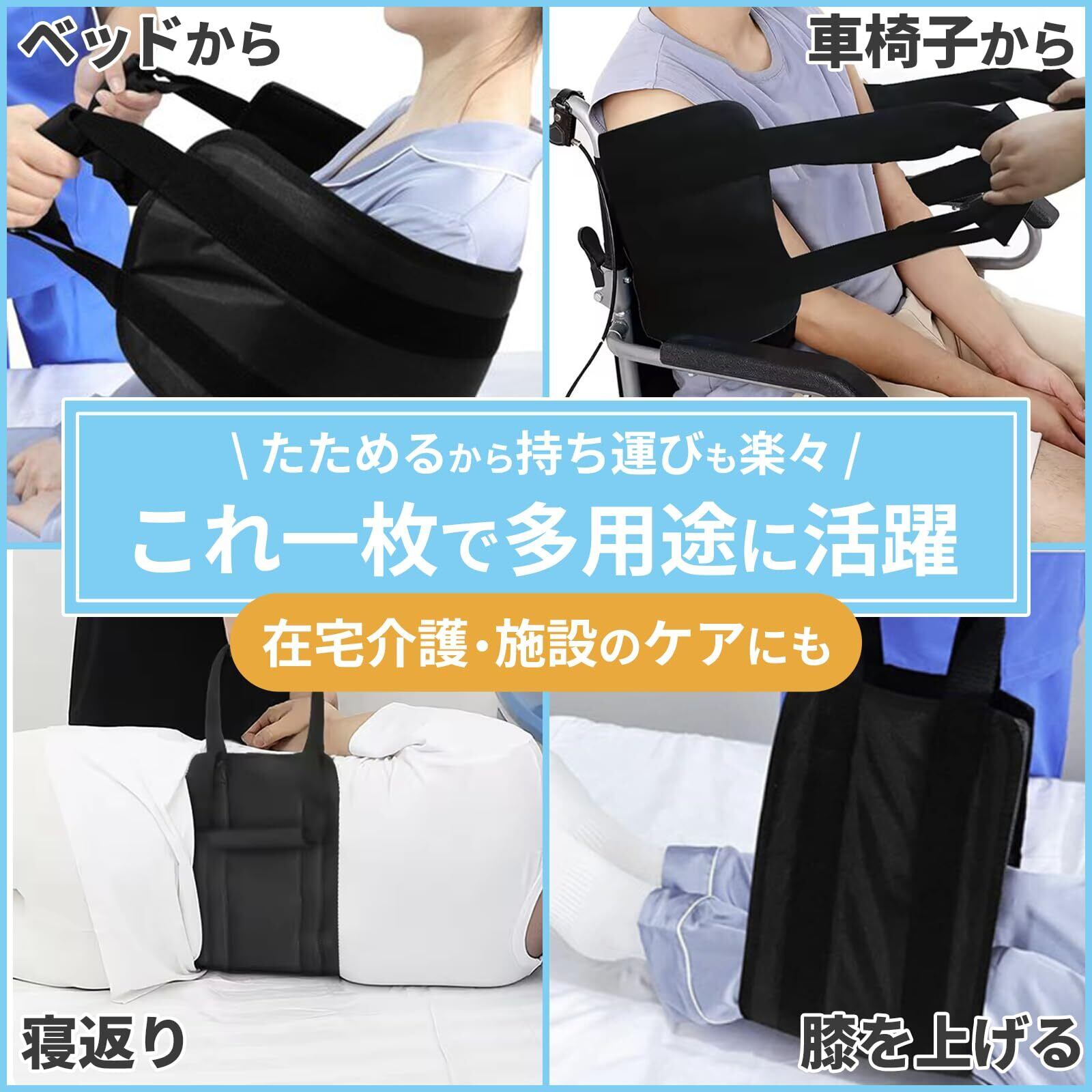 【これ一枚で多用途に活躍】ベッドからの起き上がり、車椅子やトイレへの移乗、寝返り介助、足やひざの持ち上げまで幅広く活用可能。折りたためばコンパクトで、必要な時にさっと取り出せる便利さも魅力。在宅介護はもちろん、施設でのケアにも最適です。