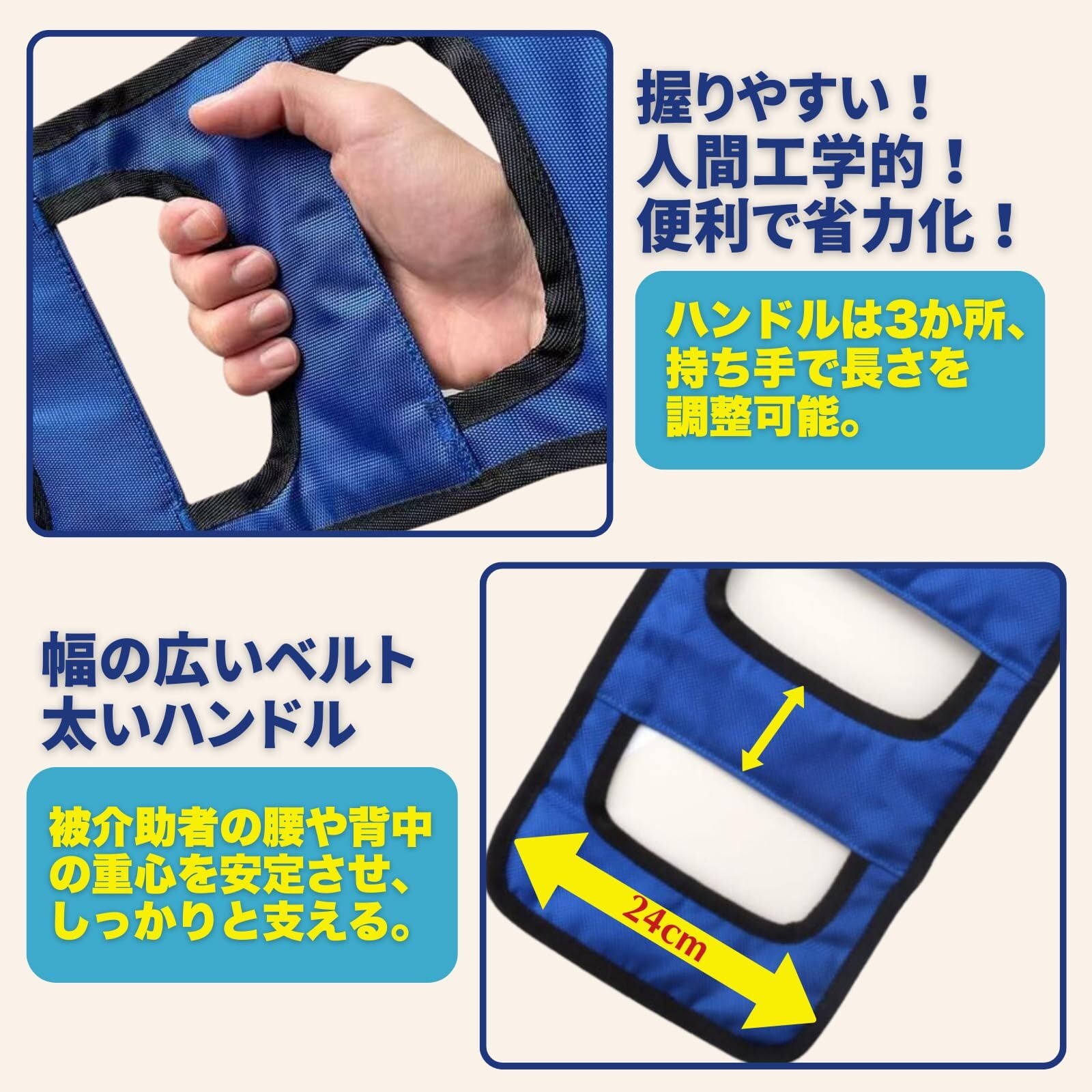 介助用ベルトは、ロング幅24センチで被介助者の腰回り、背中などの重心を安定させしっかりホールド。握りやすいハンドルは3か所、長さは持ち手で変えられます。蒸れにくい通気性の良いメッシュ、ナイロン製。