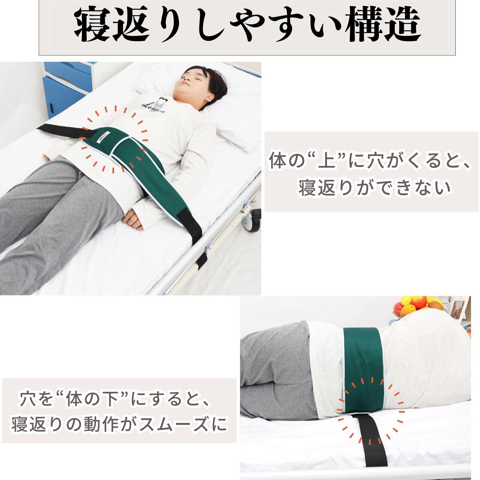 【寝返りしやすい構造】体の“上”に穴がくると、寝返りができない。この穴を“体の下”にすると、寝返りの動作がスムーズに。患者様の快適な体位変換を助け、褥瘡(床ずれ)予防にもつながります。