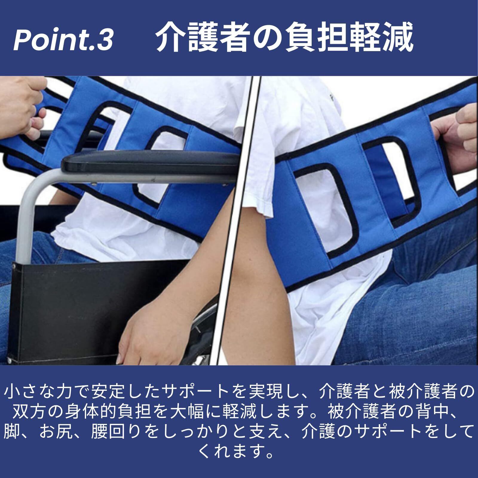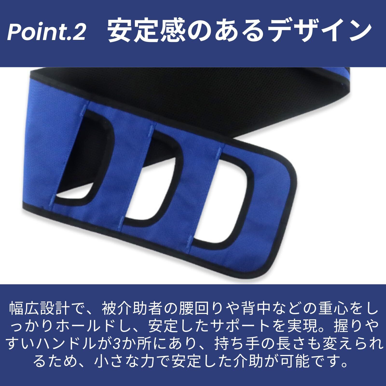 【安定感のあるデザイン】ロング幅24センチの幅広設計で、被介助者の腰回りや背中などの重心をしっかりホールドし、安定したサポートを実現する補助具です。握りやすいハンドルが3か所にあり、持ち手の長さも変えられるため、小さな力で安定した介助が可能な上に、蒸れにくい通気性の良いメッシュ・ナイロン製で、快適に使用できます。