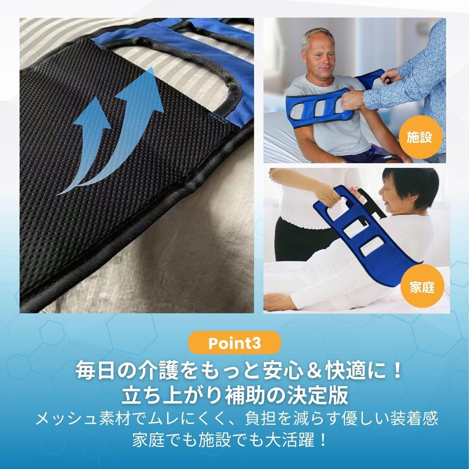 クッション性のあるパッド:内蔵コットンパッドが優しくフィットし、メッシュ素材で快適な着用感を提供。長時間の使用でも体に負担をかけにくい仕様です。起き上がり、足上げ、膝曲げ、寝返り、立ち上がり、移乗などの補助に最適な便利グッズです。
