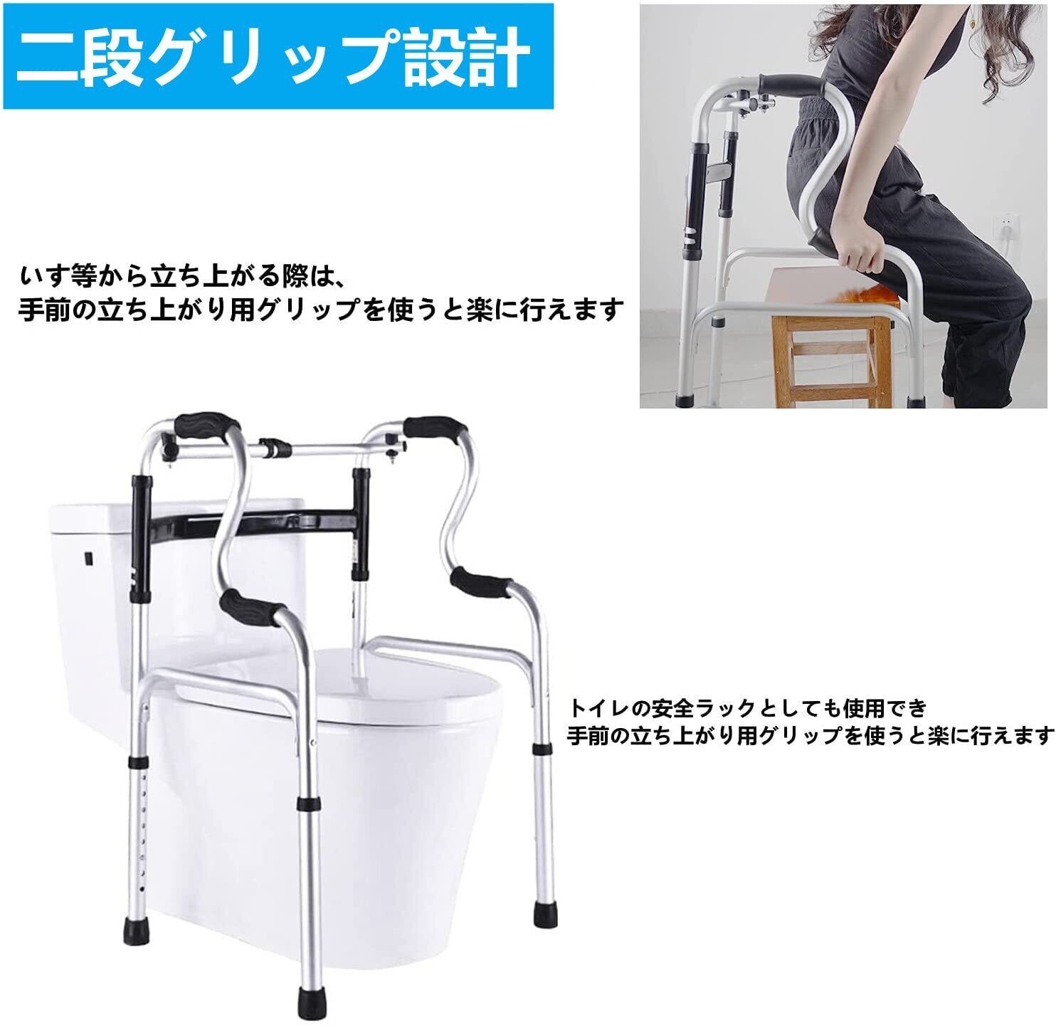 【多機能歩行器】少し安定感が必要な方に最適なユニークな折りたたみ式歩行器です。2段ハンドルで座った状態から立った状態へと徐々に変化し、トイレの安全フレームとしても使用できます。トイレで。偶発的な滑りや転倒を防ぎます。
