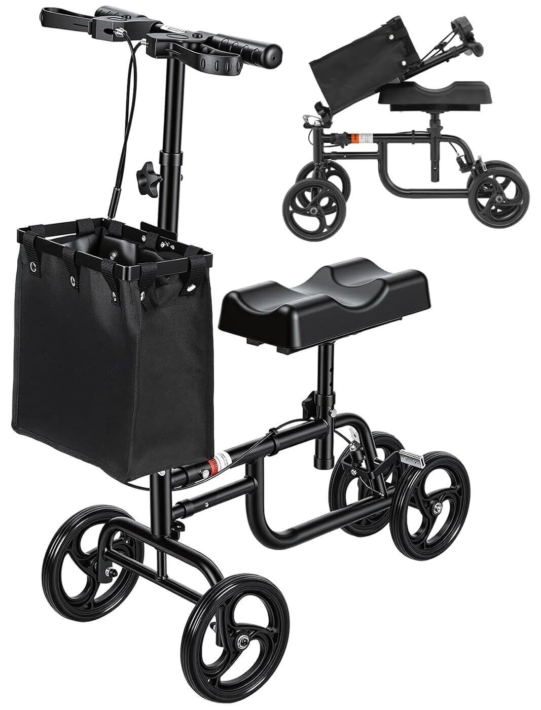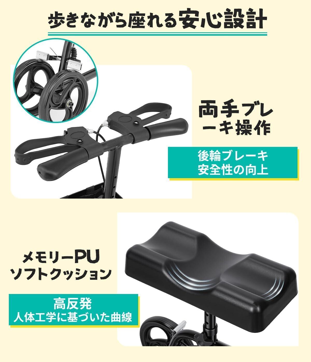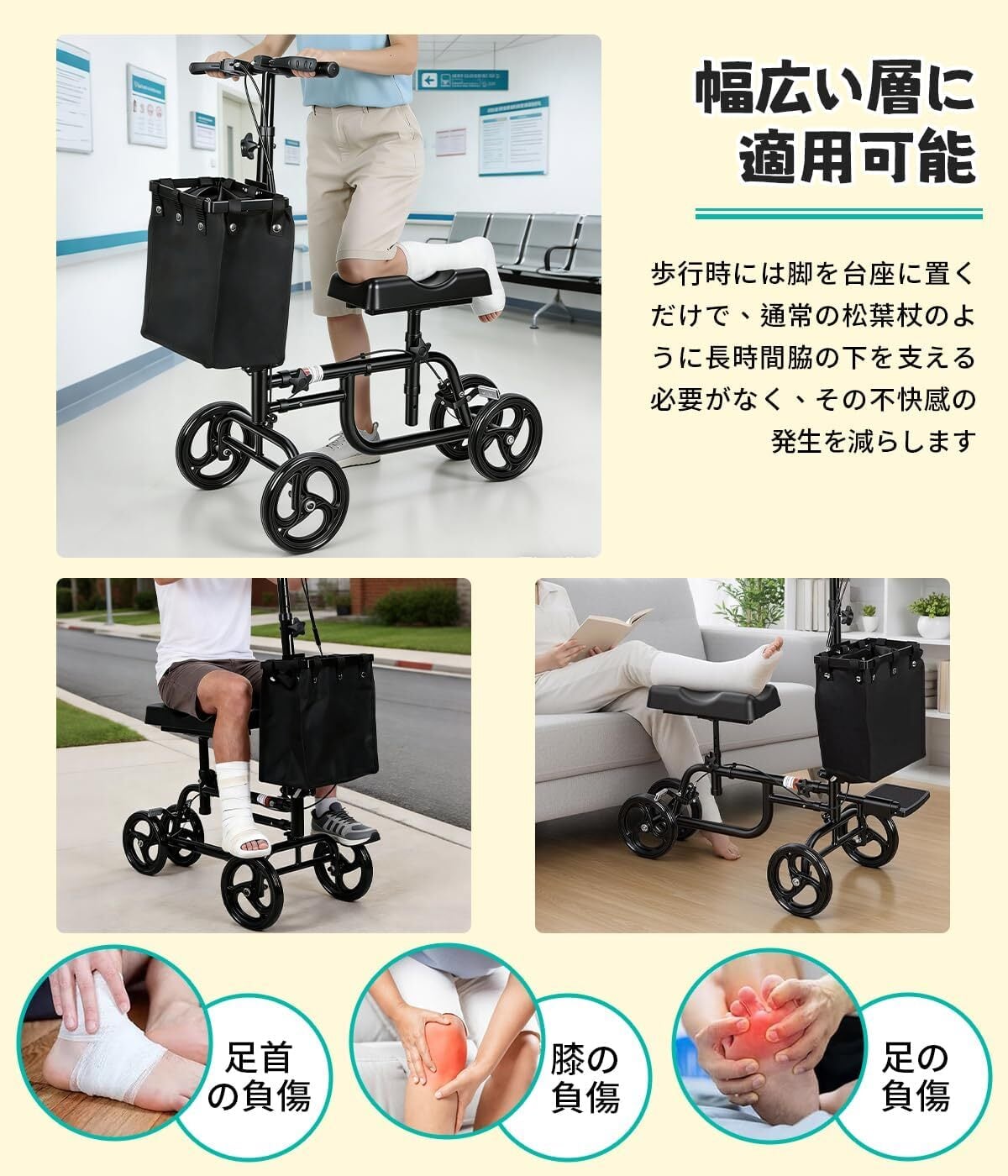【人気商品】高さ調整可能な歩行器 折り畳み式 135–185cm向け 歩行補助具 車輪付き ニースクーター 大人用 膝パッド付き 収納便利 簡単設置 (77*40.5*113cm)