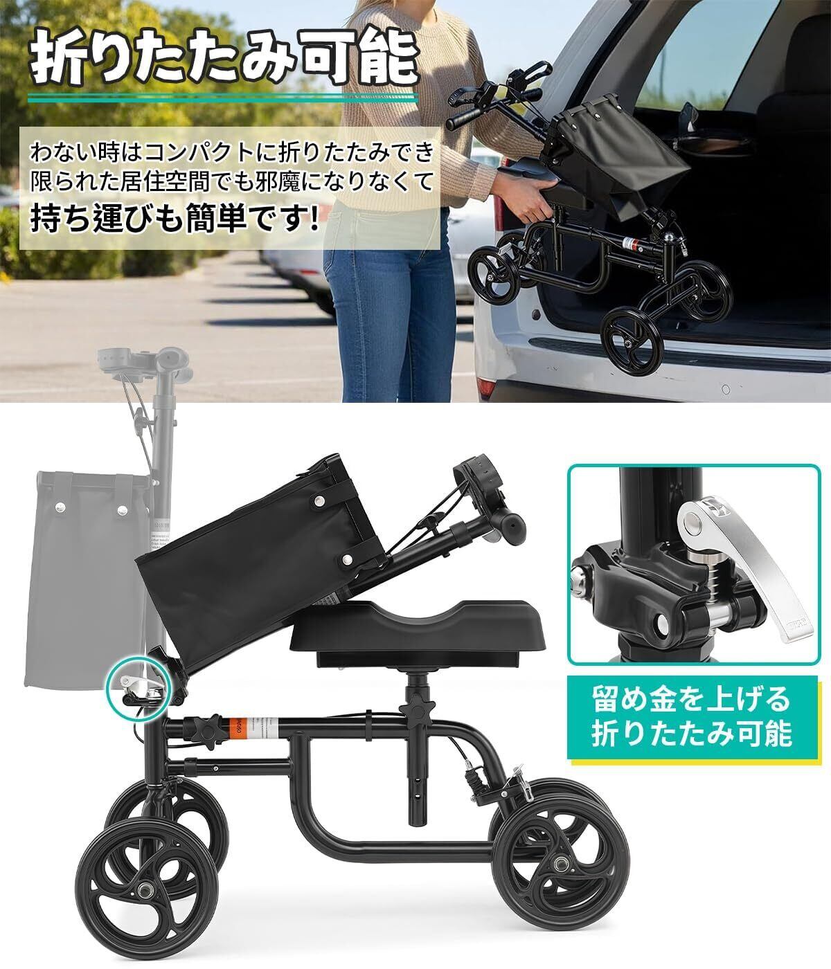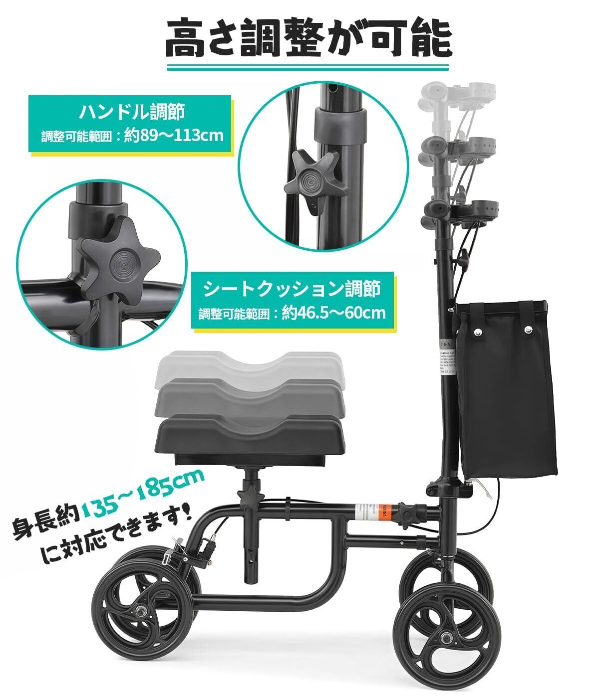 高さ調整可能な歩行器 折り畳み式 135–185cm向け 歩行補助具 車輪付き ニースクーター 大人用 膝パッド付き 収納便利 簡単設置 (77*40.5*113cm)
