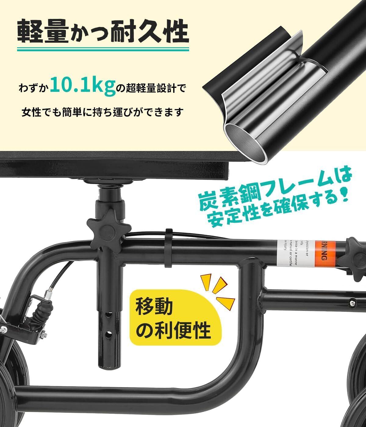 【高さ調整が可能】ハンドル・膝サポートともに昇降調整ができ、身長約135~185cmに対応できます。製品総高は約89~113cm、座面高は約46.5~60cmまで調整可能です。炭素鋼フレームで安定性がよく、約10.1kgの本体重量で扱いやすさも両立します