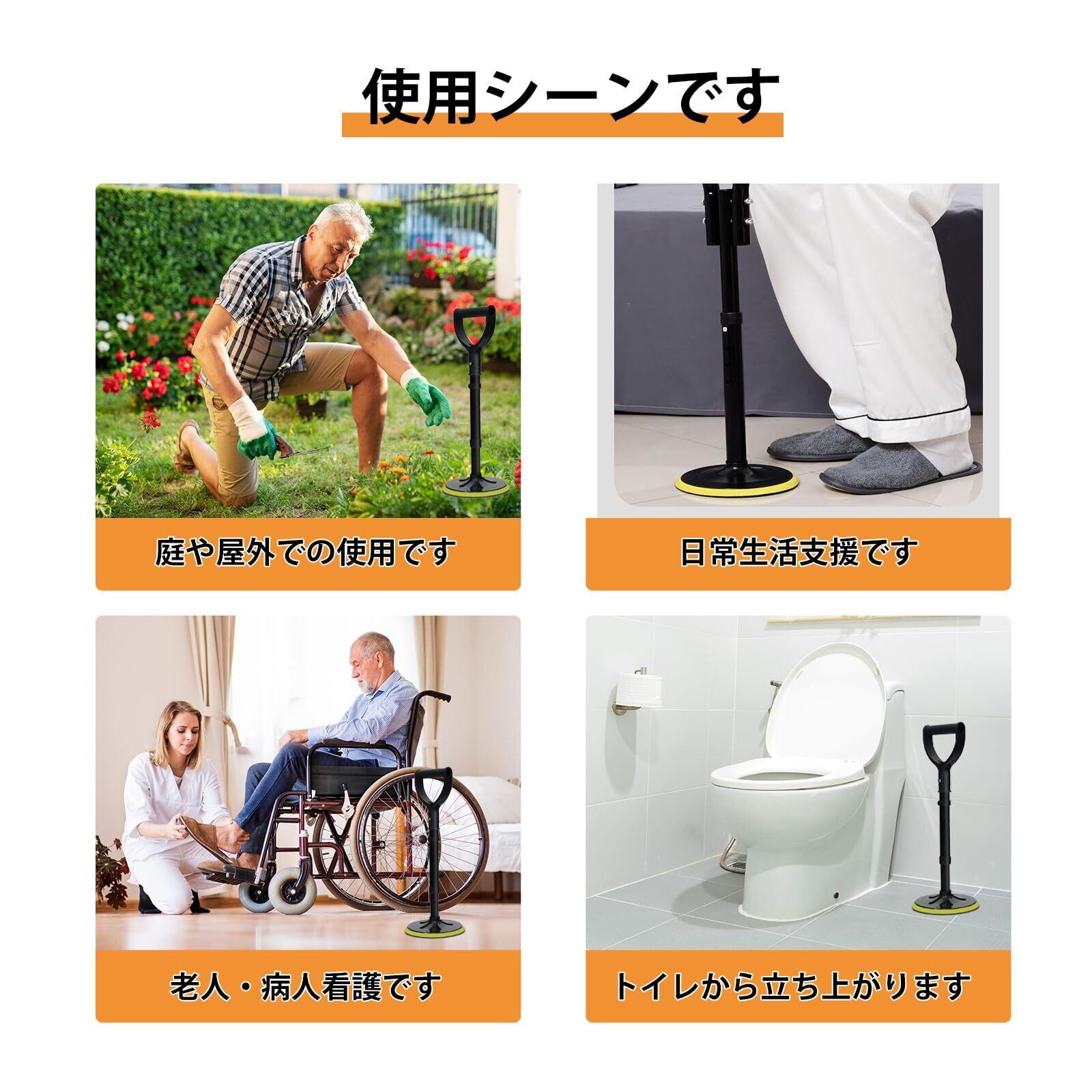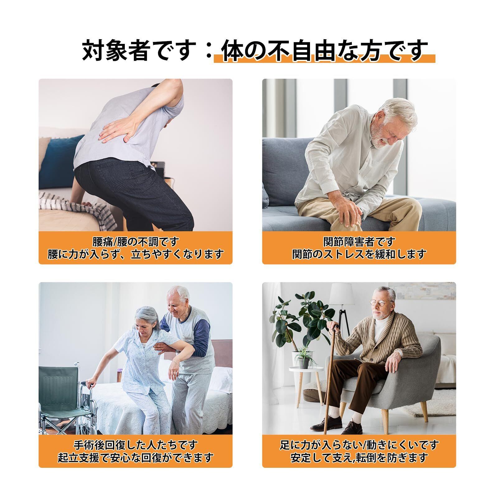 【幅広い対象者・使用シーン】腰や関節に不安のある方、下肢が弱い高齢者や体力の低下した方に最適。散歩、トイレ、浴室、リハビリなど様々な日常シーンで安心して使用できる介護用品 立ち上がり補助です。