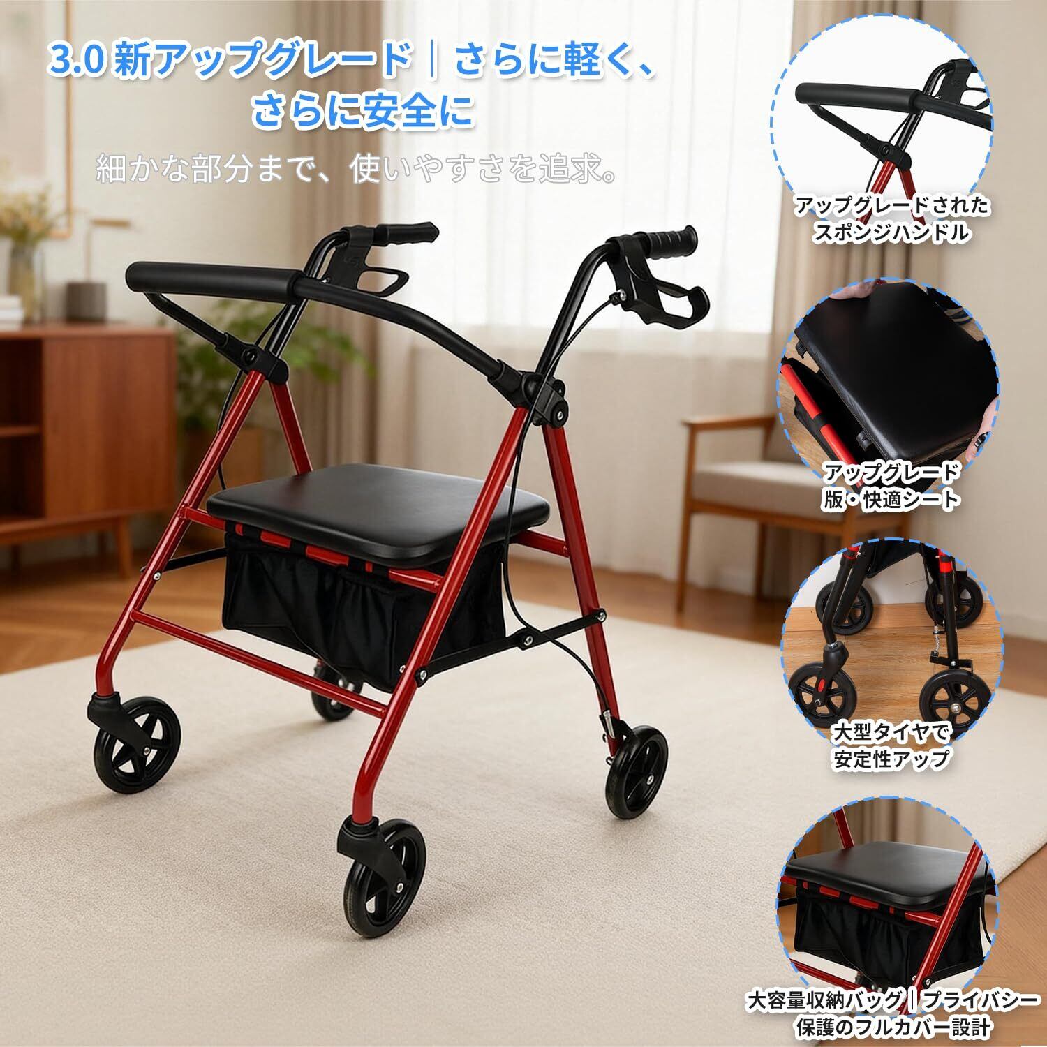 4. 買い物カゴ付き&収納便利 取り外し可能なカゴ付きで、買い物やお散歩時の荷物をしっかり収納。お買い物サポートにもぴったり。