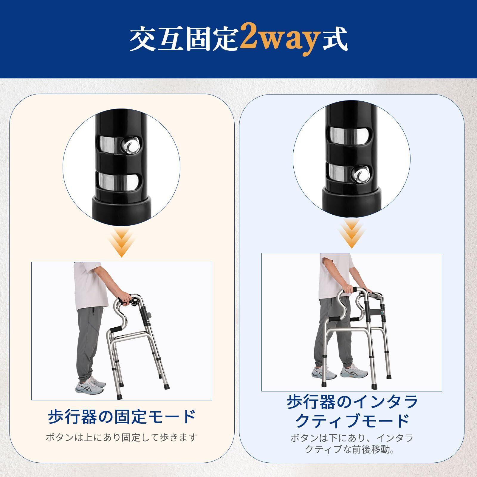 【固定/交互切り替え2way式】人間工学に基づき設計され、「固定モード」と「交互モード」を簡単切替。様々なシーンに対応し、日常歩行からリハビリ時まで、安定したサポートを提供します。