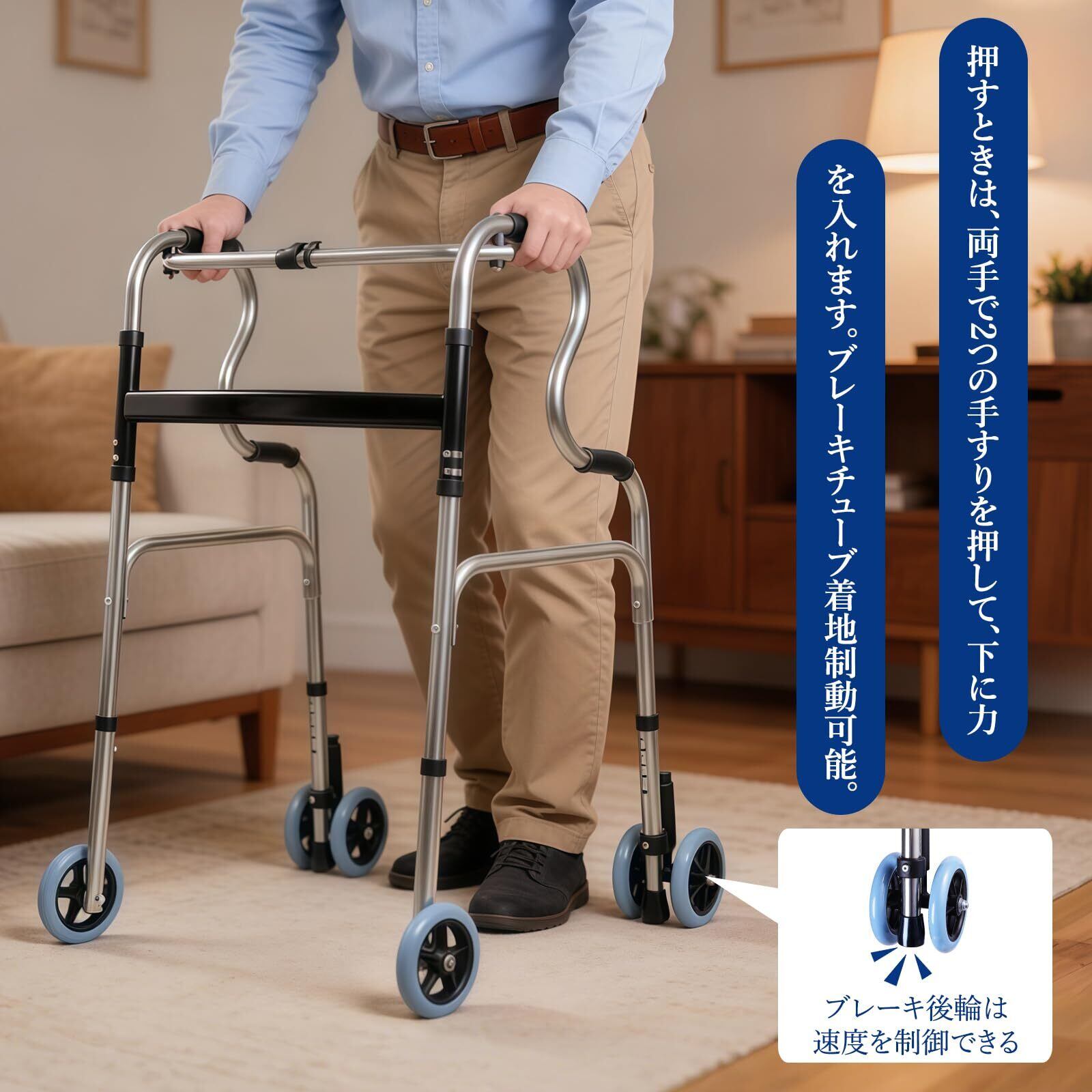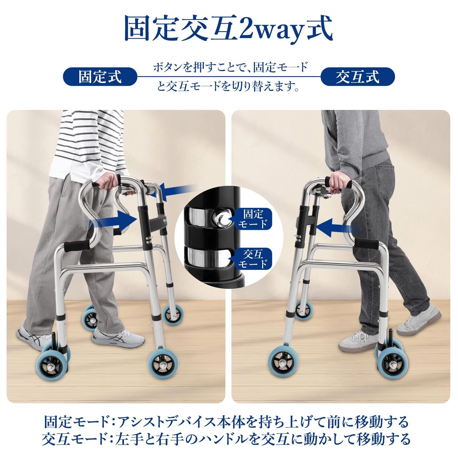 歩行器 高齢者用 室内 屋外兼用 交互 固定 2way キャスター ブレーキ付き 軽量 コンパクト 折りたたみ 高さ調節可能 ステンレス製 立ち上がり補助 介護用 リハビリ 組立不要