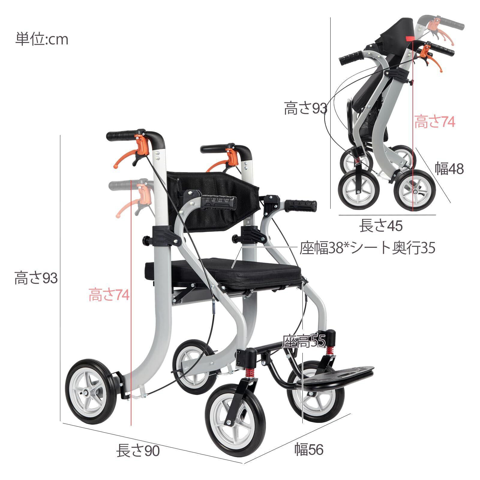 【高品質&軽量】シルバーカーの本体構造は、高品質のアルミニウム材質を採用しています。本体サイズ:長さ90*幅56*高さ74-93CM。折りたたみサイズ:長さ45*幅48*高さ74㎝。収納箱サイズ:長さ約34cm×幅17cm×高さ17cm。座面:幅約38cm×奥約35cm。背もたれ高さ:29CM。 パッケージサイズ:幅約37cm×高約17cm×奥約23cm 重量:約9.5kg(手動測定のため、多少の誤差がある場合があります)