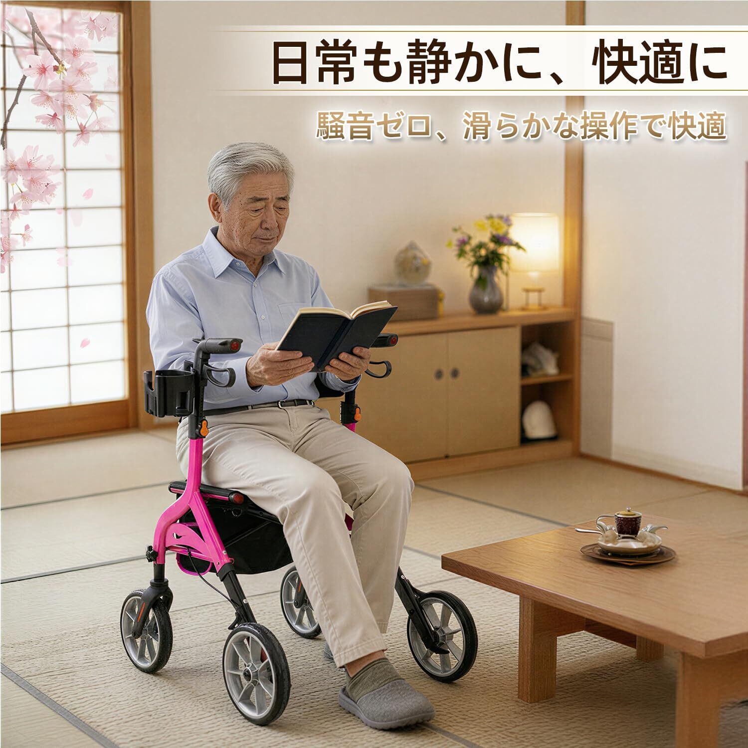 [多用途・万能モデル:屋内・屋外を問わず活躍] 屋内では床を傷つけず静かに使用でき、屋外の散歩・買い物・通院にも最適。座面でいつでも休憩でき、収納バッグと水筒・携帯・杖ホルダーを標準装備し利便性を高めています。