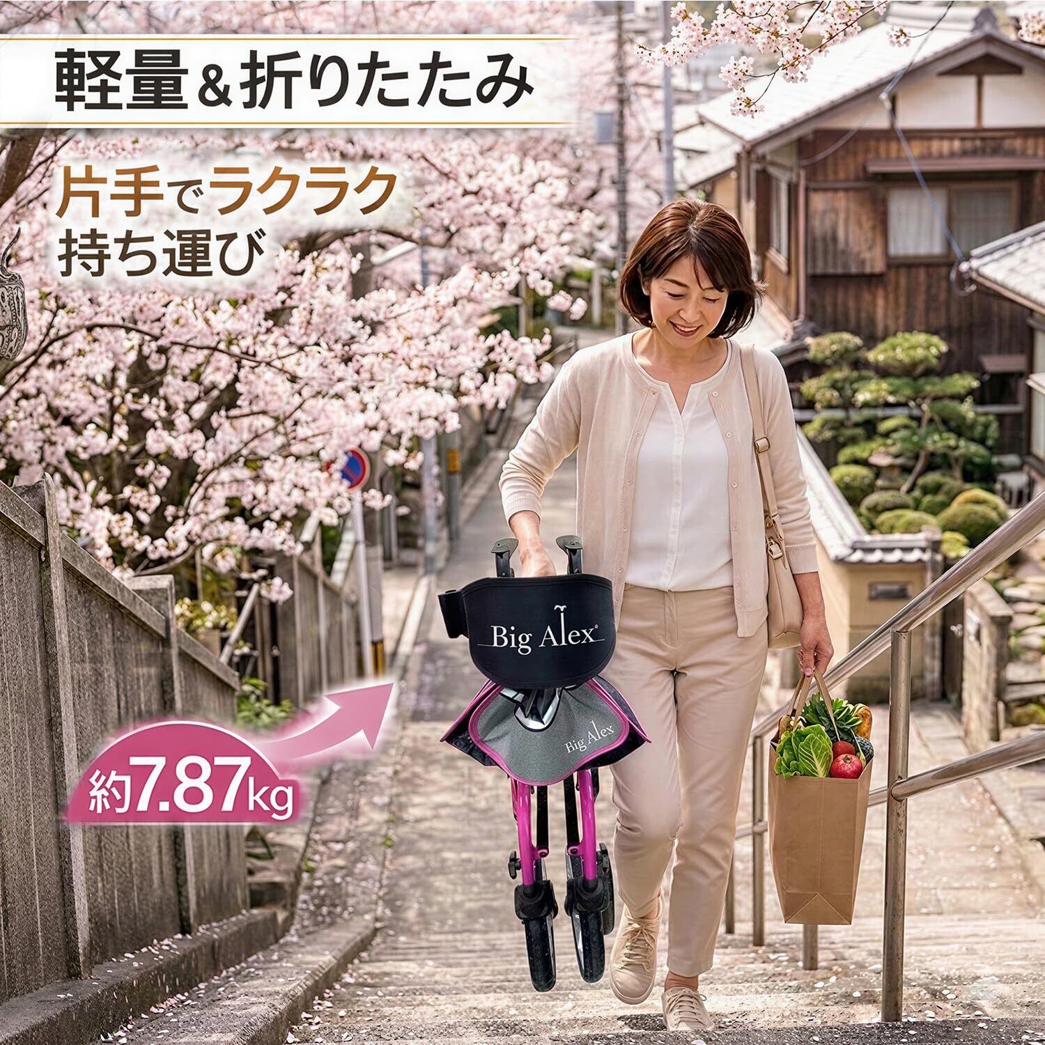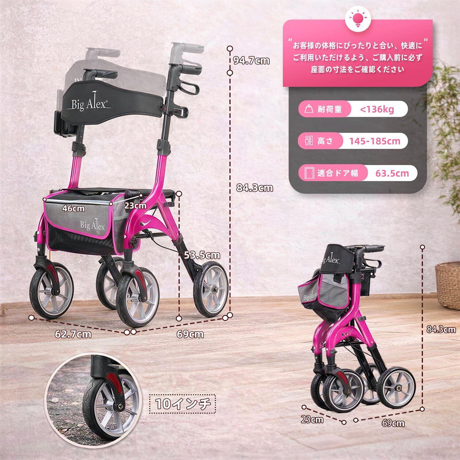 BigAlex 歩行器 超軽量 コンパクト 女性用 高齢者用 室内 屋外 座れる 折り畳み式 高さ調節可 ブレーキロック機能付き 手押し車 老人 四輪歩行車 歩行補助 介護用品 超軽量アルミ製 杖ホルダー付き 水杯ホルダー付き 大容量収納バッグ付き 母の日 説明書付き