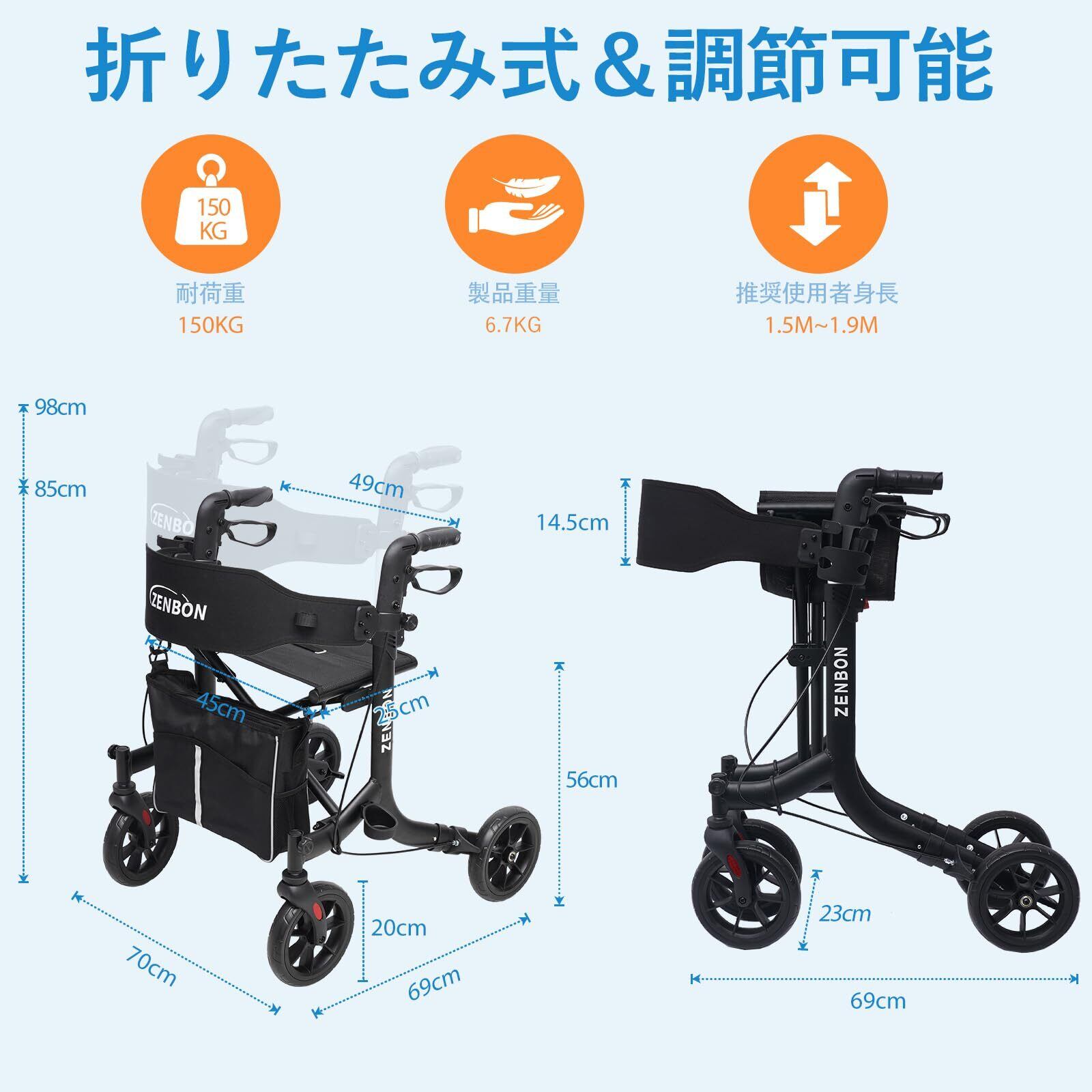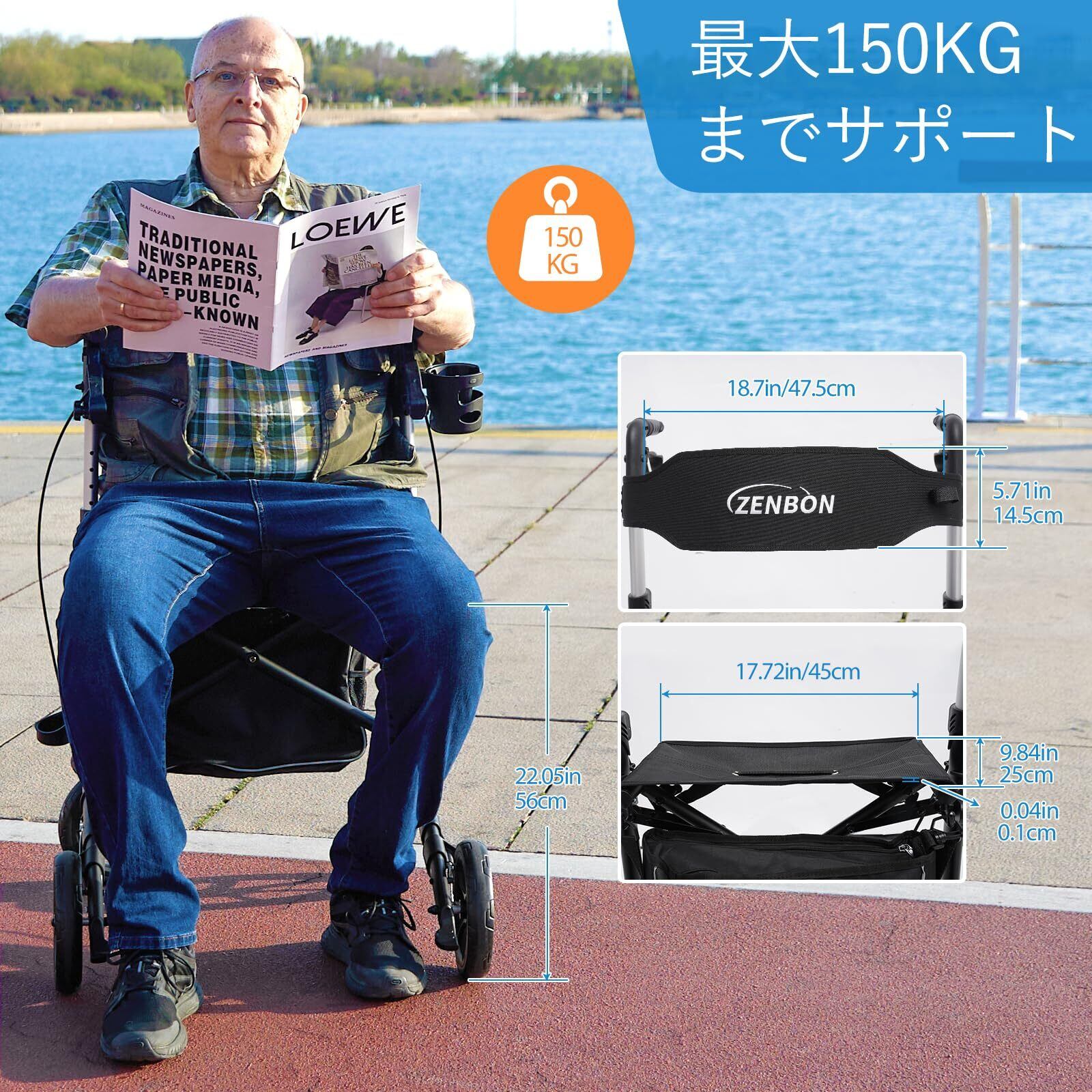 快適な座席と大容量収納:最大耐荷重150kgの快適な座席付きで、休憩時にも便利です。座席下には9.6Lの収納バッグがあり、日常的な小物や買い物袋を収納できます。背もたれは調整可能で、より快適な姿勢でリラックスできます。散歩や外出時の安心ポイントです。