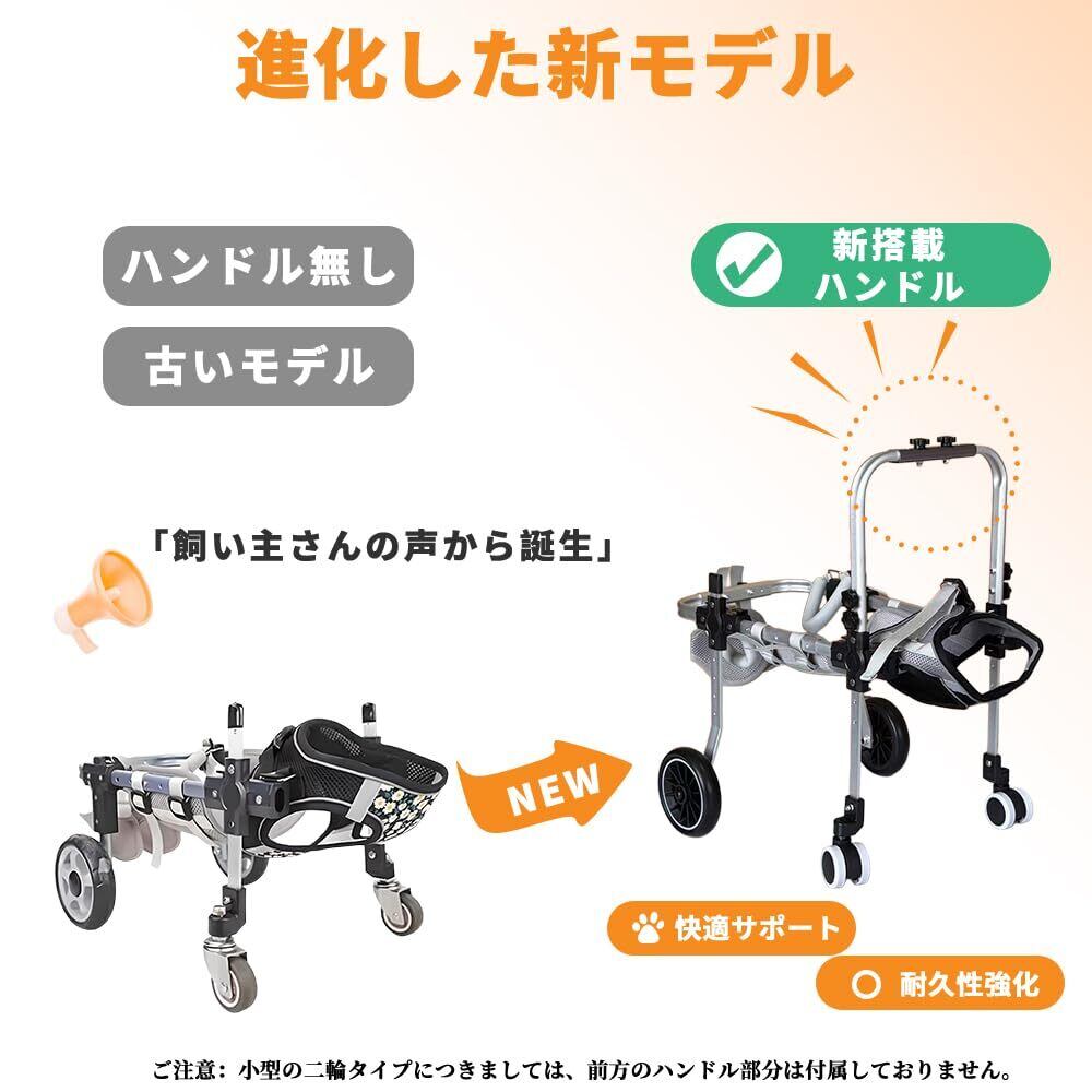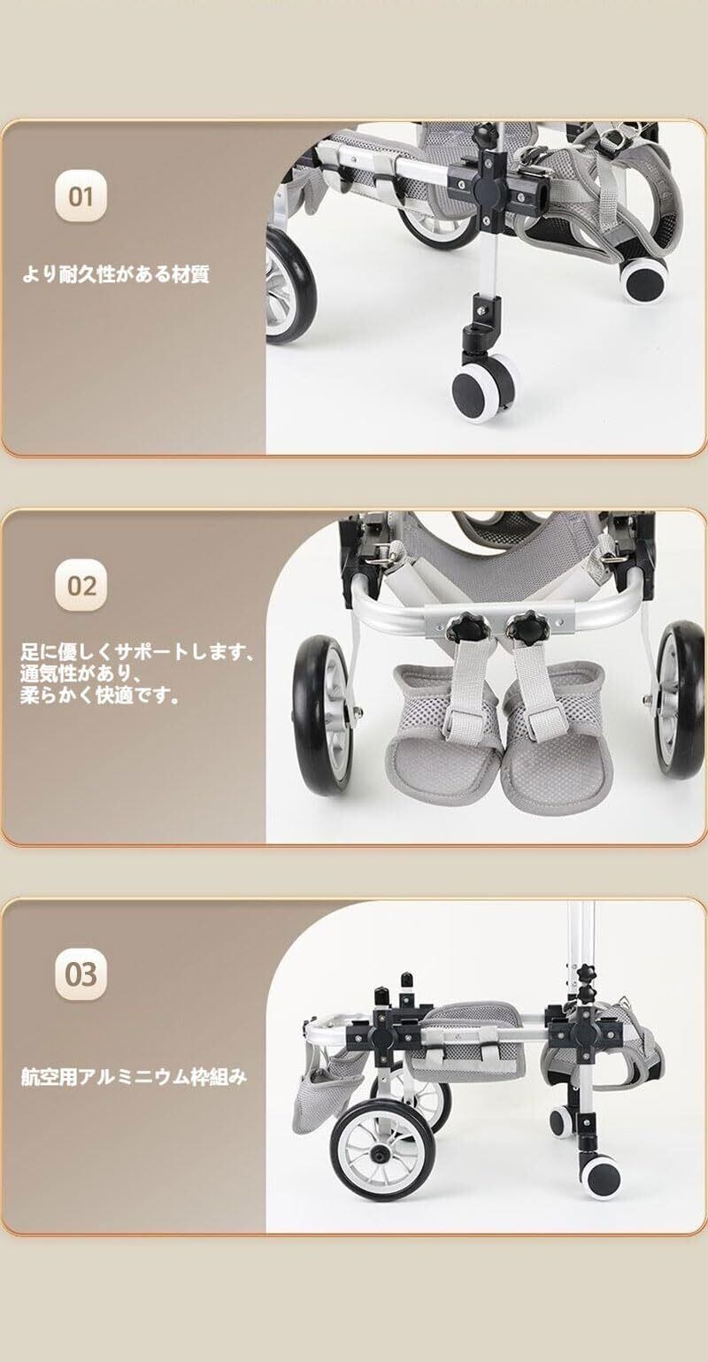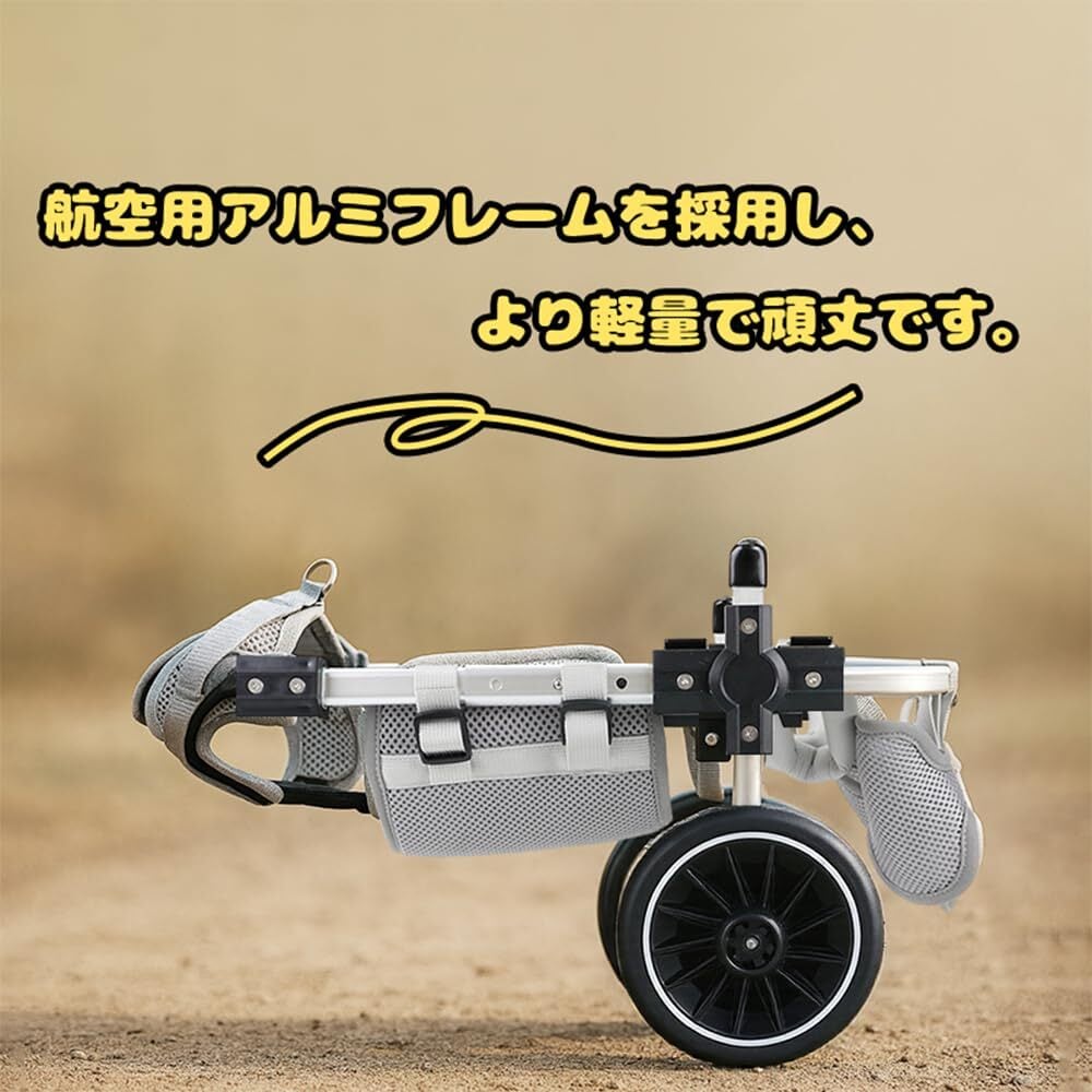 2. 軽くて頑丈!毎日のリハビリにも負担ナシ 車体フレームは強度を保ちつつ、軽量化に成功。小柄な飼い主さんでも持ち運びやすく、ワンちゃんの負担も軽減。毎日使う介護アイテムとしても最適です。