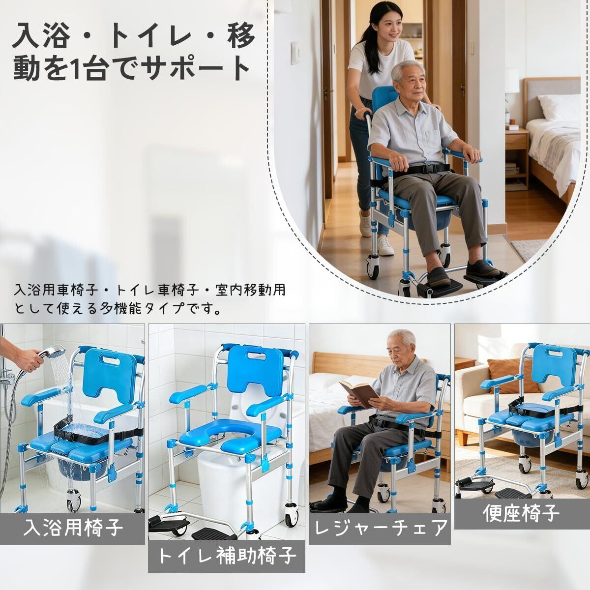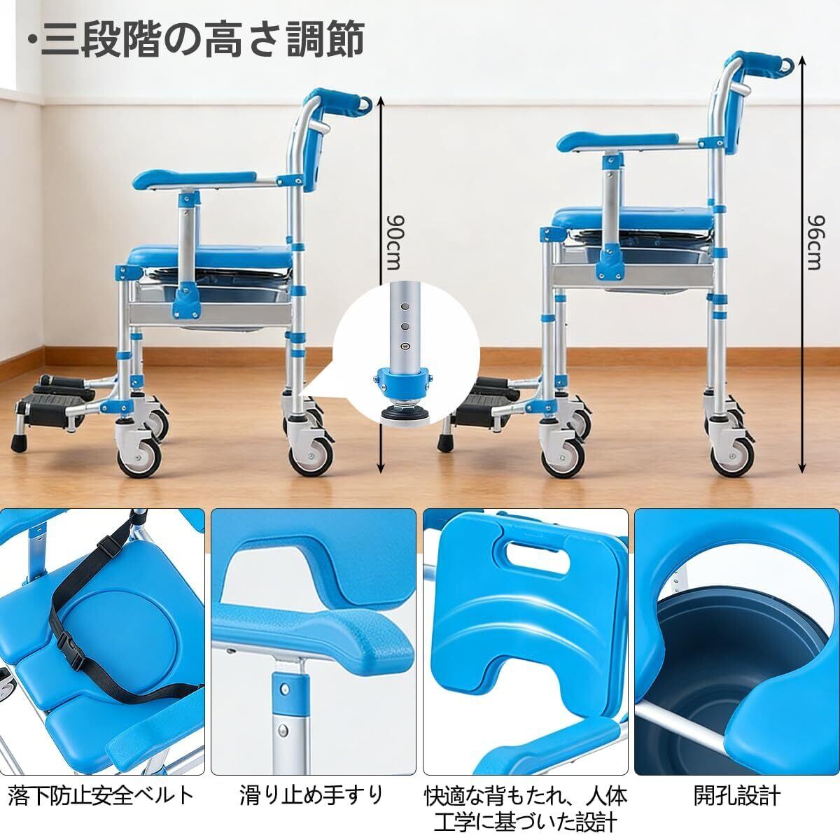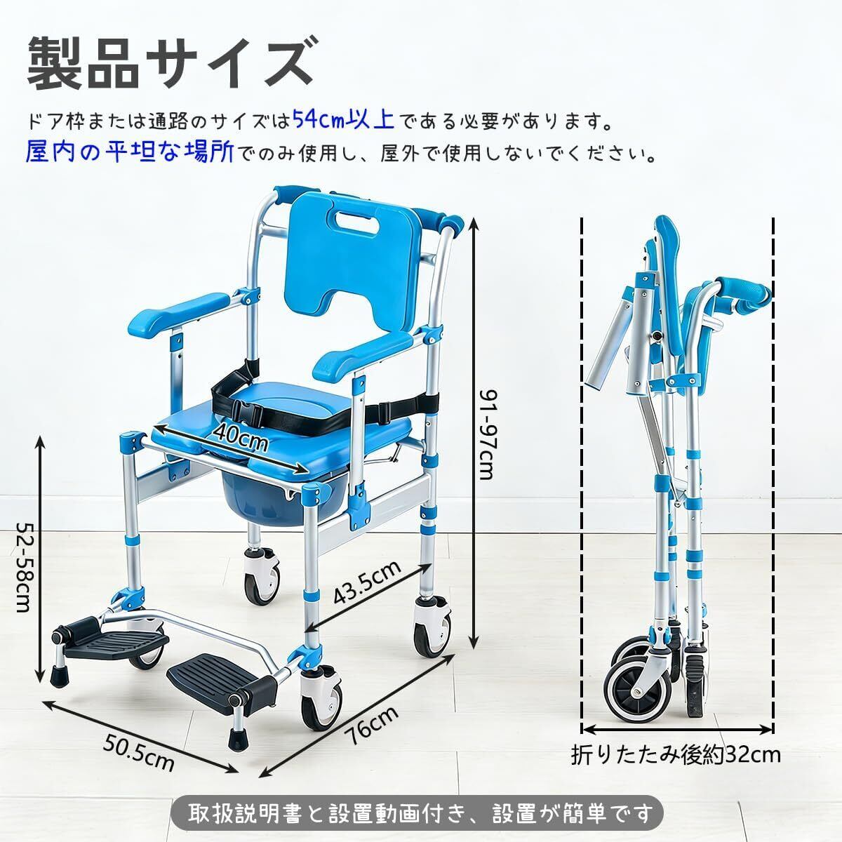 介護用車椅子 入浴・トイレ兼用 折りたたみ式 シャワーチェア 自在キャスター ブレーキ付き 3 段階高さ調整可能 フットレスト付き ソフト座面 介助用 軽量設計 耐荷重約 200kg 防水仕様 高齢者用 障がい者用 福祉用品 リハビリ対応 日本語説明書付き(ブルー、幅 50.5× 奥行 76× 高さ 91–97cm)